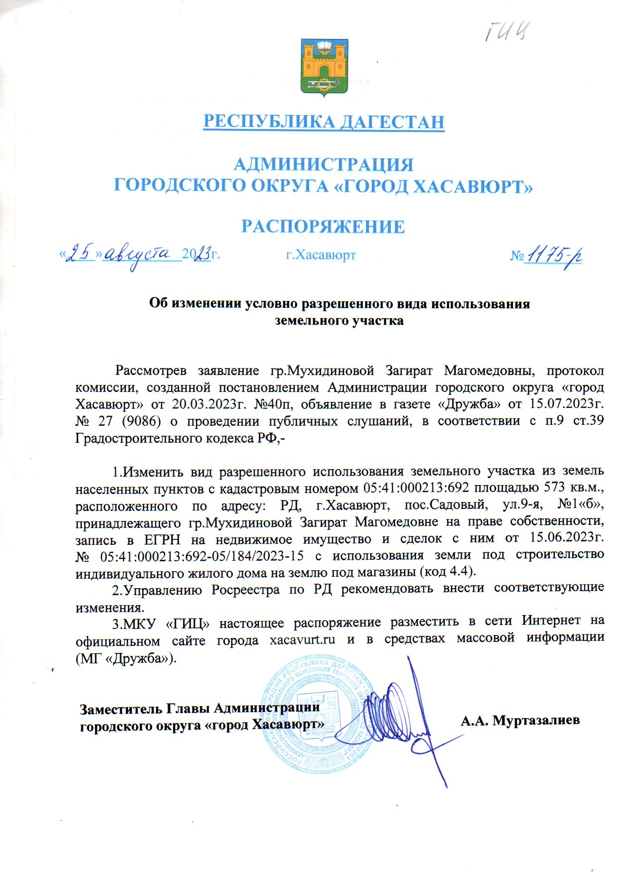 Распоряжение № 1175-р от 25 августа 2023 г. Об изменении условно разрешенного вида использования земельного участка