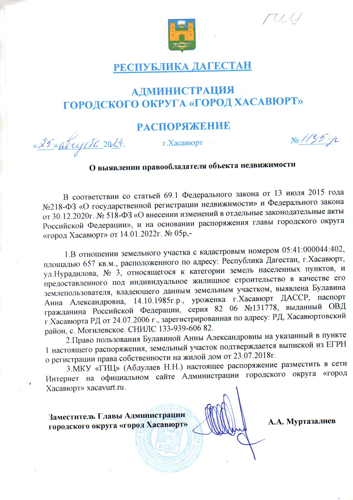 Распоряжение № 1195-р от 25 августа 2023 г. О выявлении правообладателя объекта недвижимости