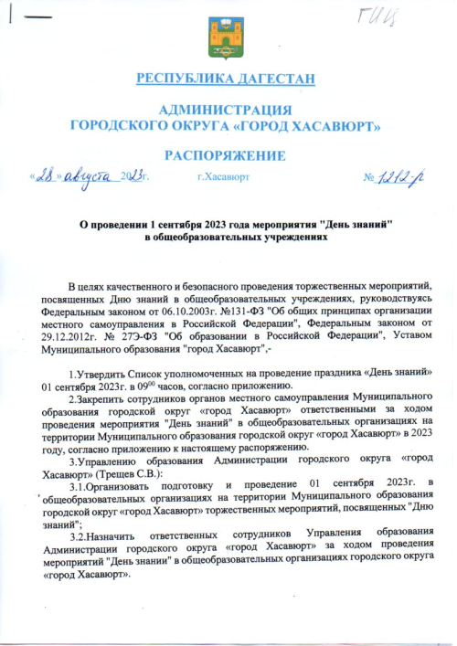 Распоряжение № 1212-р от 28 августа 2023 г. О проведении 1 сентября 2023 года мероприятия "День знаний" в общеобразовательных учреждениях