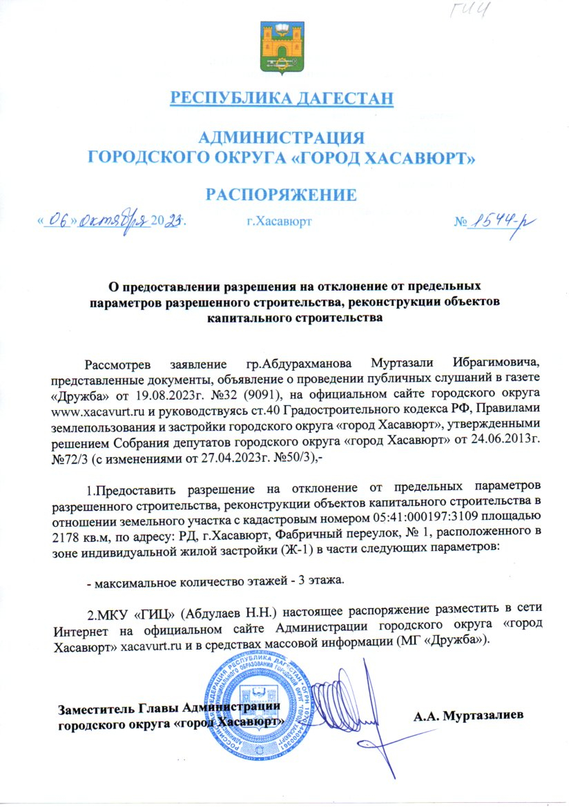 Распоряжение от 06 октября 2023 г. № 1544-р О предоставлении разрешения на отклонение от предельных параметров разрешенного строительства, реконструкции объектов капитального строительства