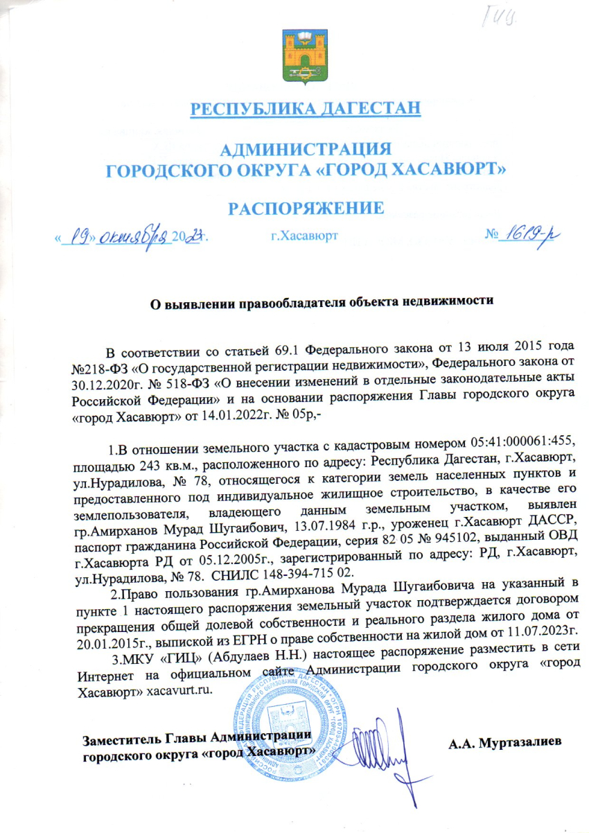 Распоряжение от 19 октября 2023 г. № 1619-р О выявлении правообладателя объекта недвижимости