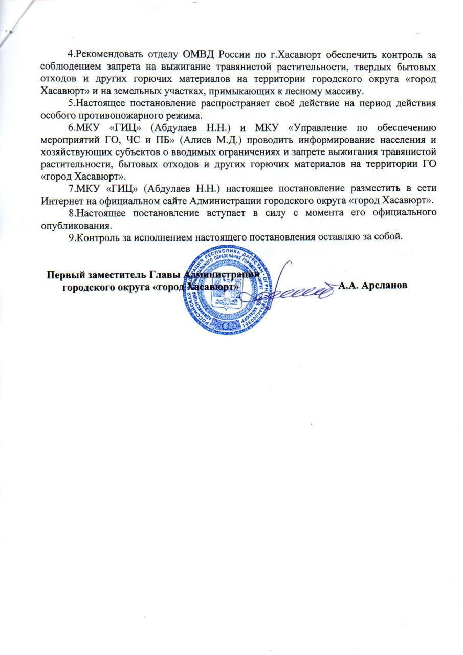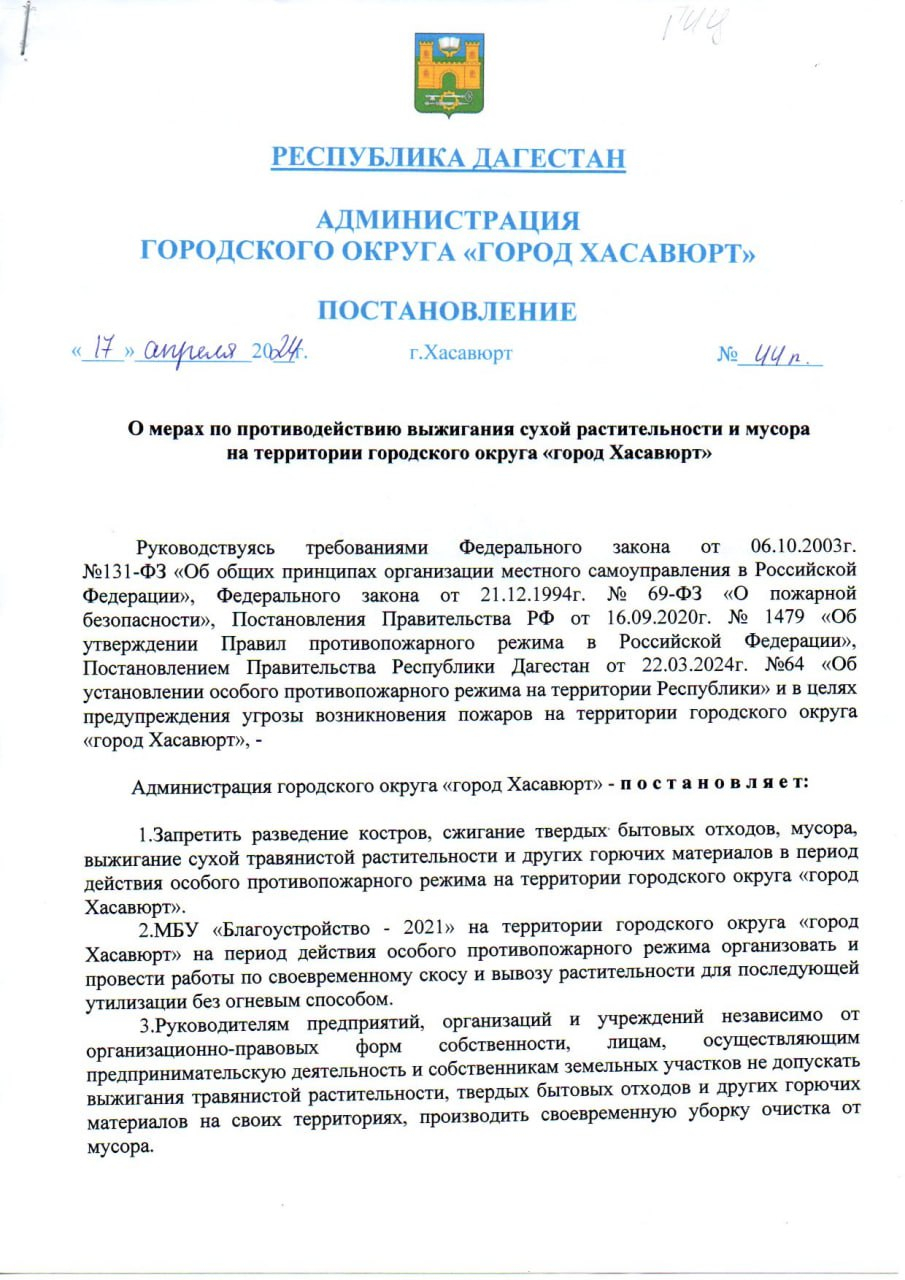 Постановление от 17 апреля 2024 г. № 44п О мерах по противодействию выжигания сухой растительности и мусора на территории городского округа "город Хасавюрт"