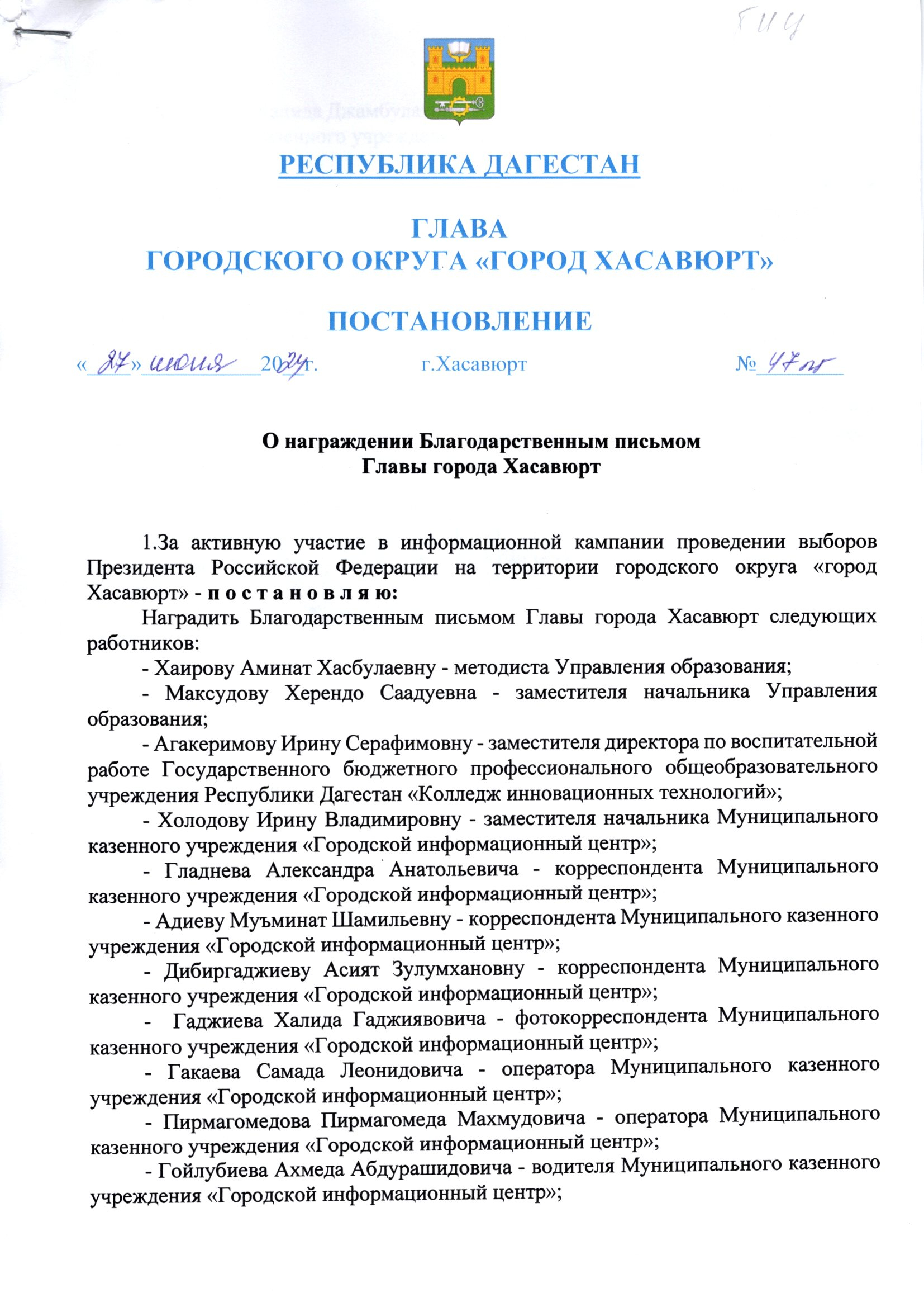 Постановление от 27 июня 2024 г. № 47пг О награждении Благодарственным письмом Главы города Хасавюрт