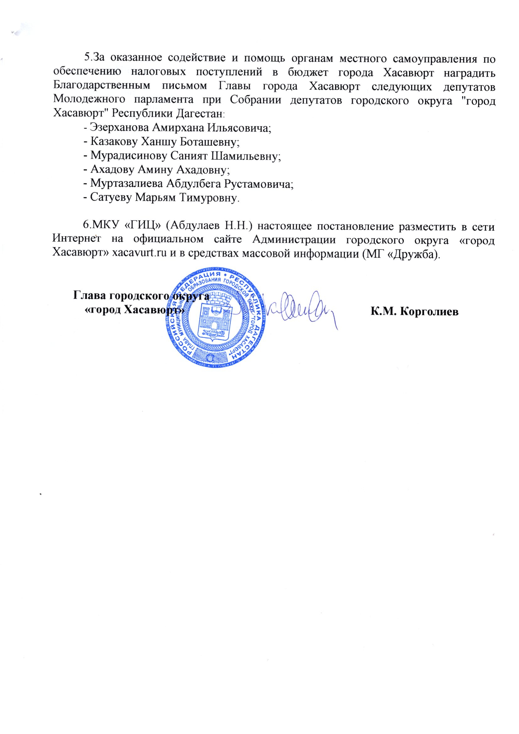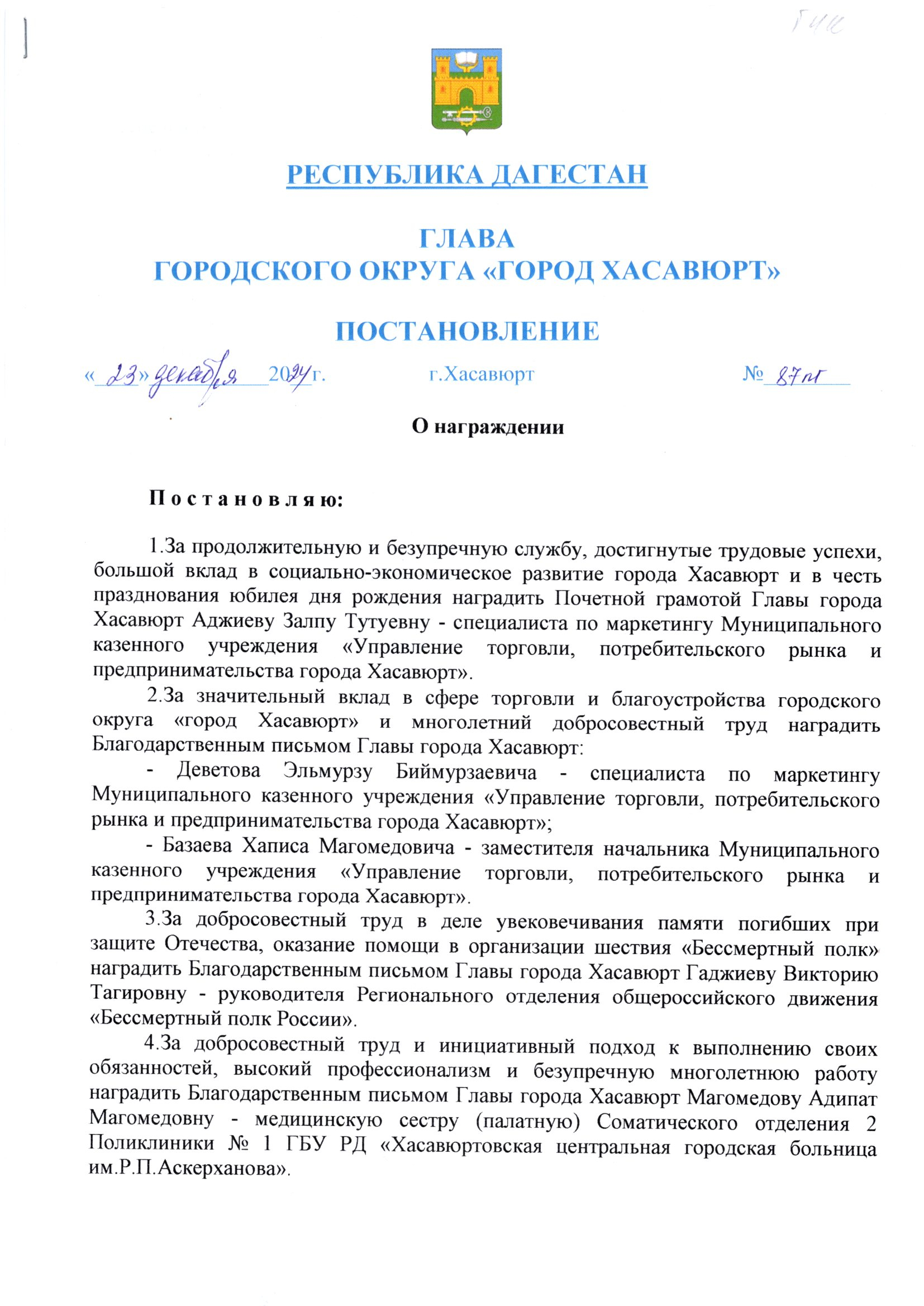 Постановление от 16 декабря 2024 г. № 77пг О награждении Благодарственным письмом Главы города Хасавюрт