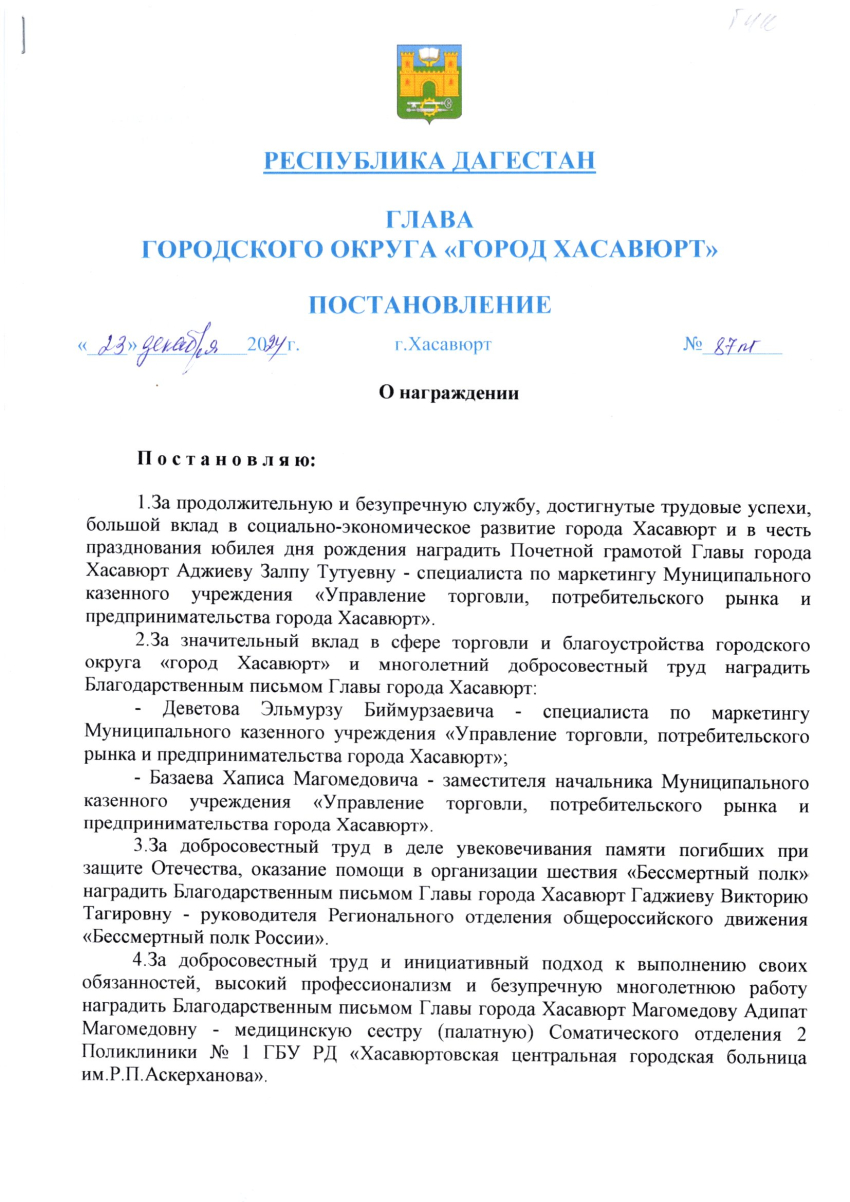 Постановление от 19 декабря 2024 г. № 80пг О награждении Благодарственным письмом Главы города Хасавюрт
