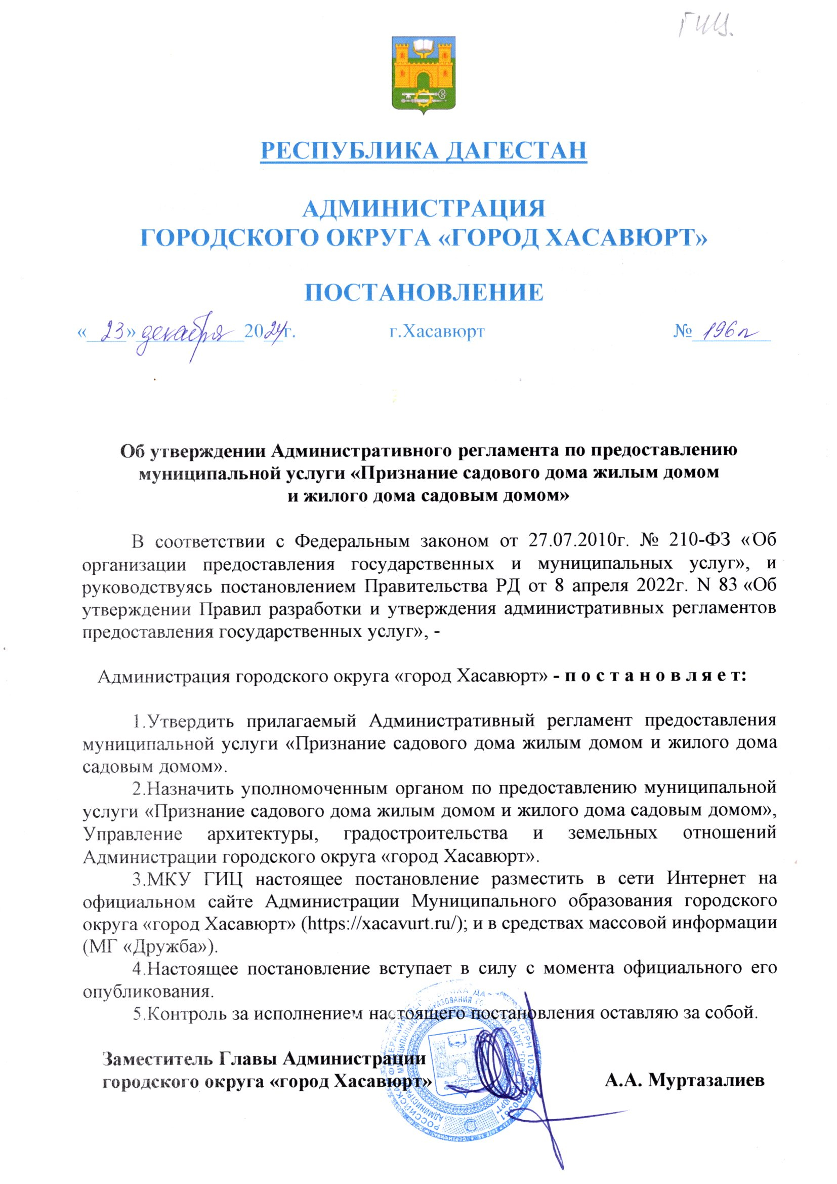 Постановление от 23 декабря 2024 г. № 196п Об утверждении Административного регламента по предоставлению муниципальной услуги «Признание садового дома жилым домом и жилого дома садовым домом»