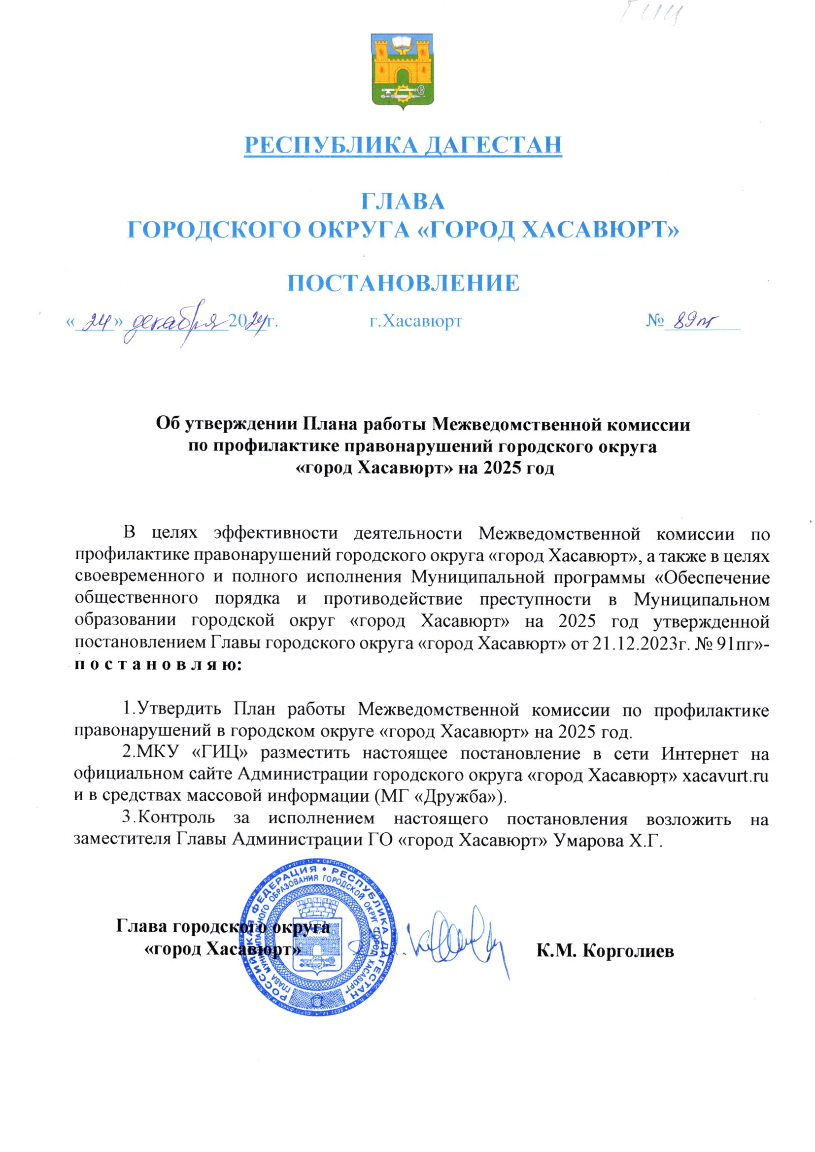 Постановление от 24 декабря 2024 г. № 89пг Об утверждении Плана работы Межведомственной комиссии по профилактике правонарушений городского округа «город Хасавюрт» на 2025 год