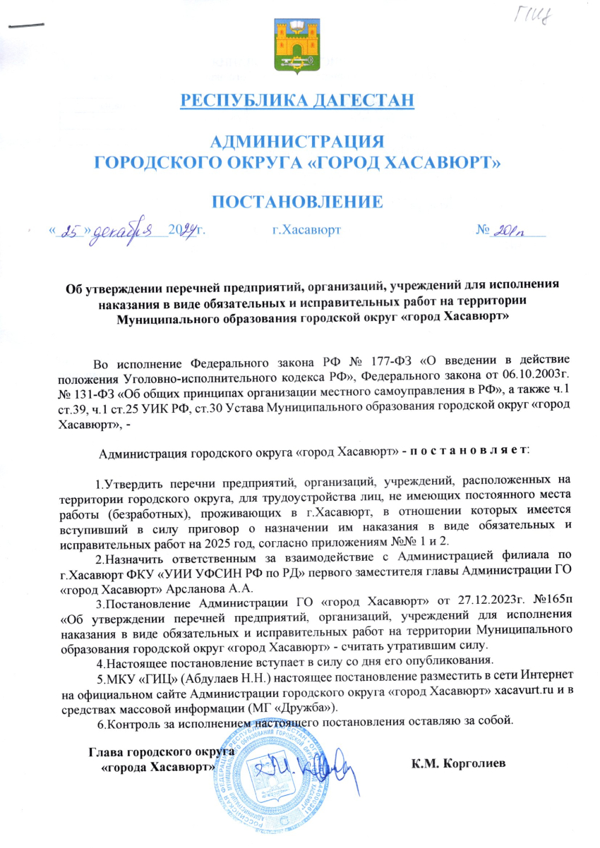 Постановление от 25 декабря 2024 г. № 201п Об утверждении перечней предприятий, организаций, учреждений для исполнения наказания в виде обязательных и исправительных работ на территории Муниципального образования городской округ «город Хасавюрт»