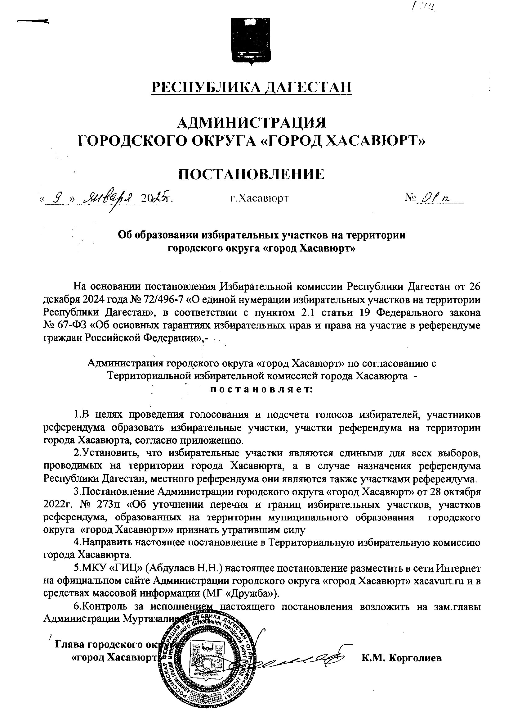 Постановление от 9 января 2025 г. № 01п Об образовании избирательных участков на территории городского округа «город Хасавюрт»