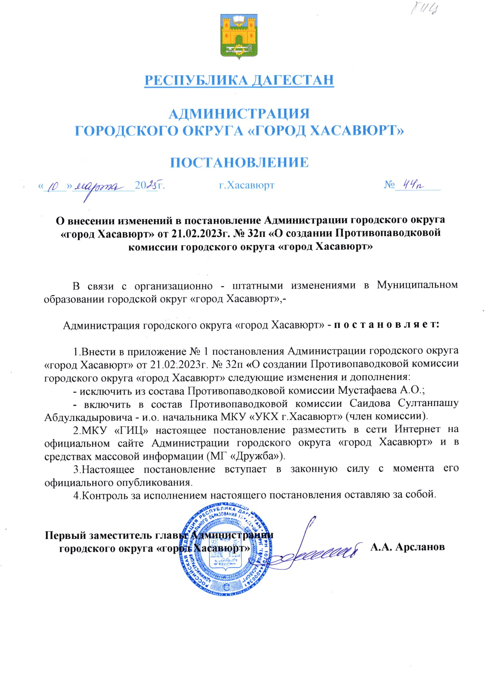 Постановление 10 марта 2025г. №44п О внесении изменений в постановление Администрации городского округа «город Хасавюрт» от 21.02.2023г. № 32п О создании Противопаводковой комиссии городского округа «город Хасавюрт»