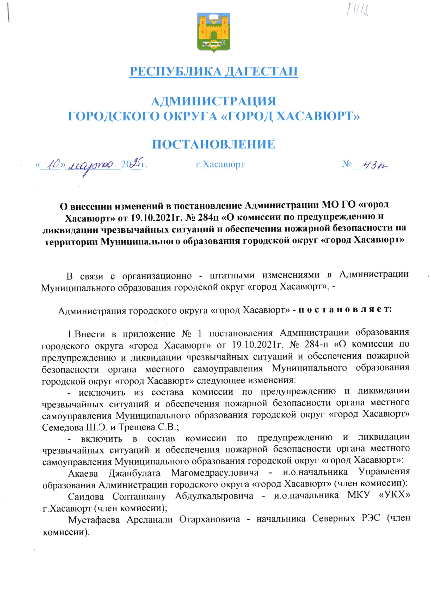 Постановление от 10 марта 2025г. №43п О внесении изменений в постановление Администрации МО ГО «город Хасавюрт» от 19.10.2021г. № 284п «О комиссии по предупреждению и ликвидации чрезвычайных ситуаций и обеспечения пожарной безопасности на территории Муниципального образования городской округ «город Хасавюрт»