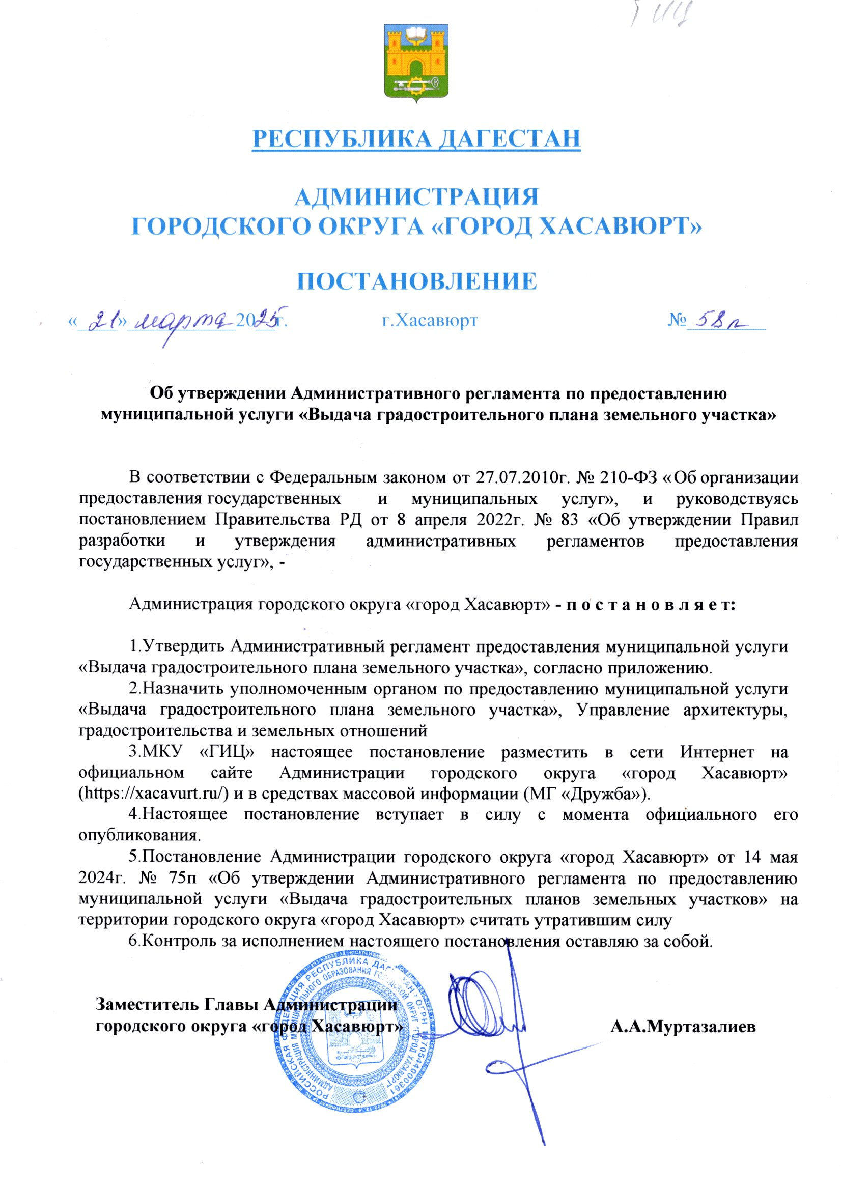 Постановление от 21 марта 2025 г. № 58п Об утверждении Административного регламента по предоставлению муниципальной услуги "Выдача градостроительного плана земельного участка"