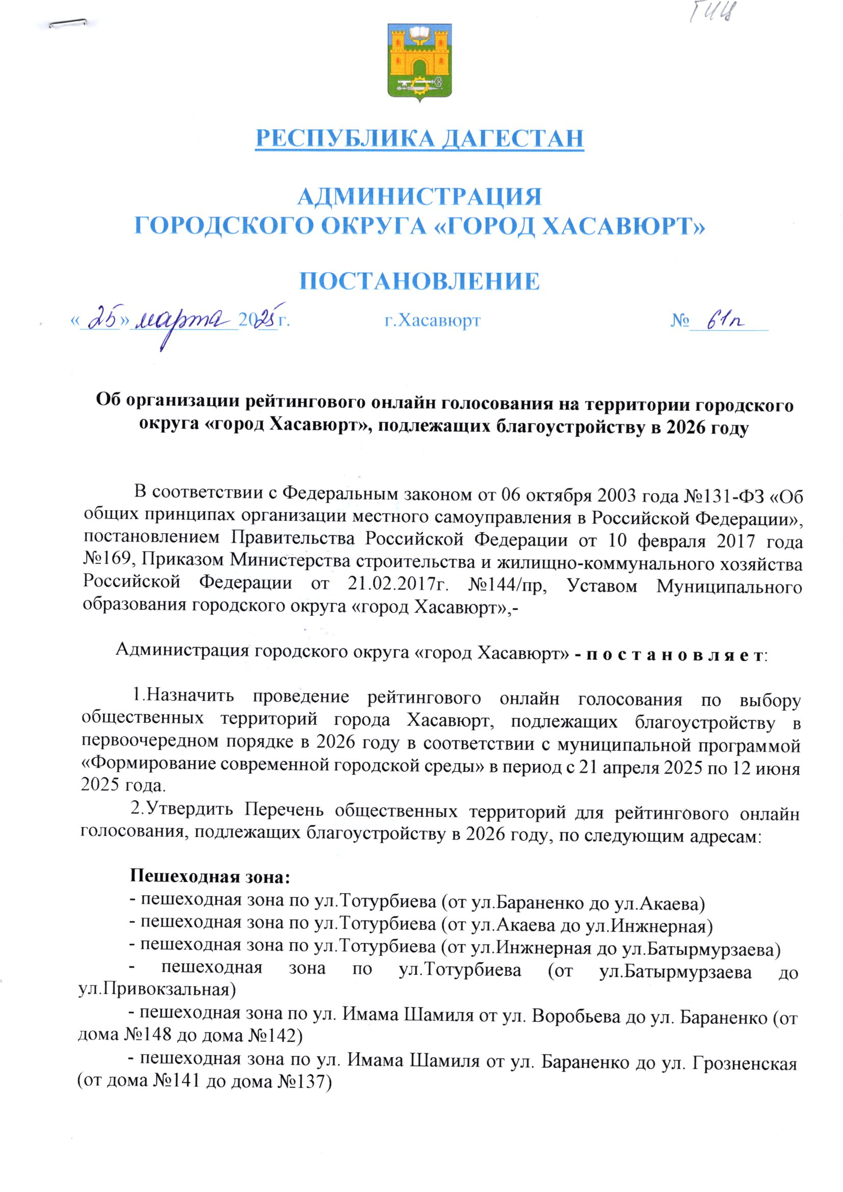 Постановление от 25 марта 2025 г. № 61п Об организации рейтингового онлайн голосования на территории городского округа "город Хасавюрт", подлежащих благоустройству в 2026 году