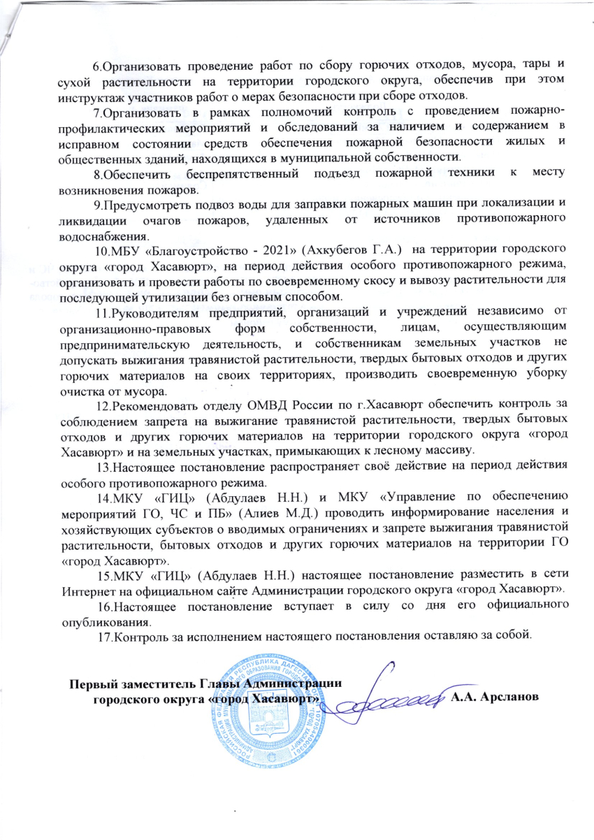 Постановление от 17 апреля 2024 г. № 44п О мерах по противодействию выжигания сухой растительности и мусора на территории городского округа "город Хасавюрт"
