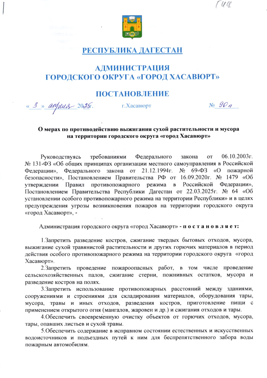 Постановление от 3 апреля 2025г. № 90-п О мерах по притиводействию выжигания сухой растительности и мусора на территории городского округа "город Хасавюрт"