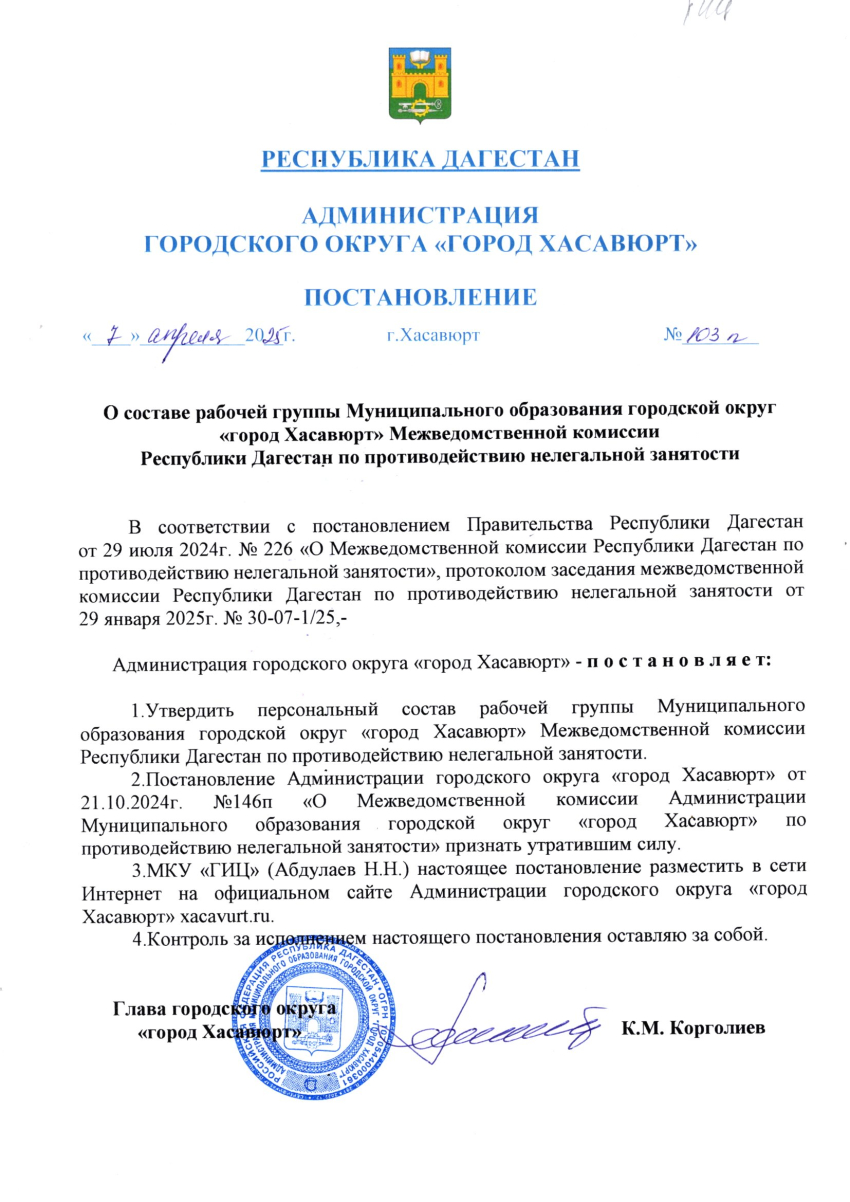 Постановление от 7 апреля 2025 г. № 103п О составе рабочей группы Муниципального образования городской округ «город Хасавюрт» Межведомственной комиссии Республики Дагестан по противодействию нелегальной занятости