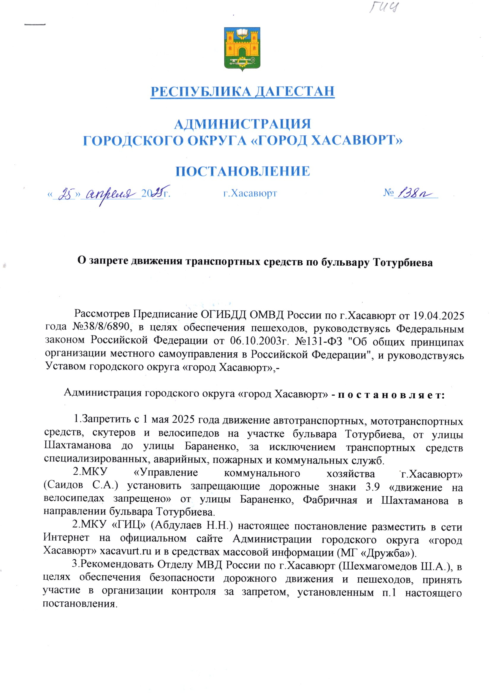 Постановление от 25 апреля 2025 г. № 138п О запрете движения транспортных средств по бульвару Тотурбиева