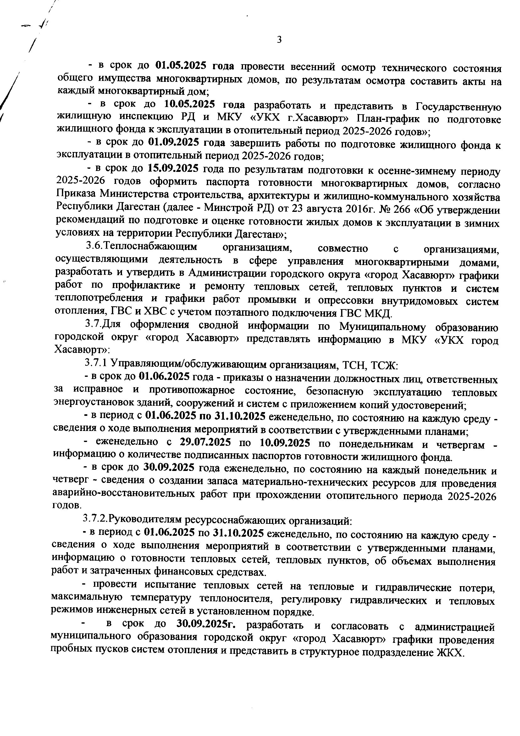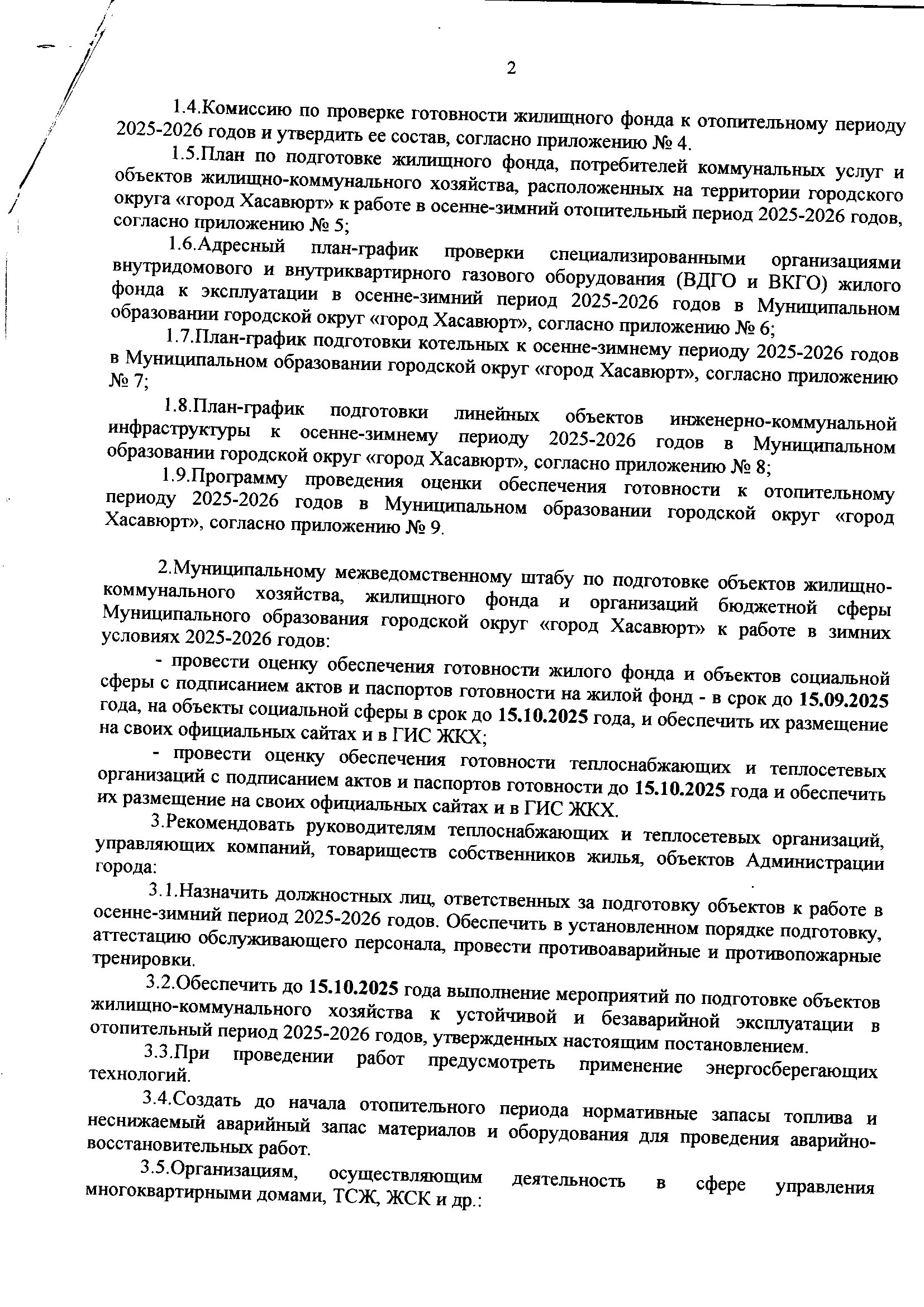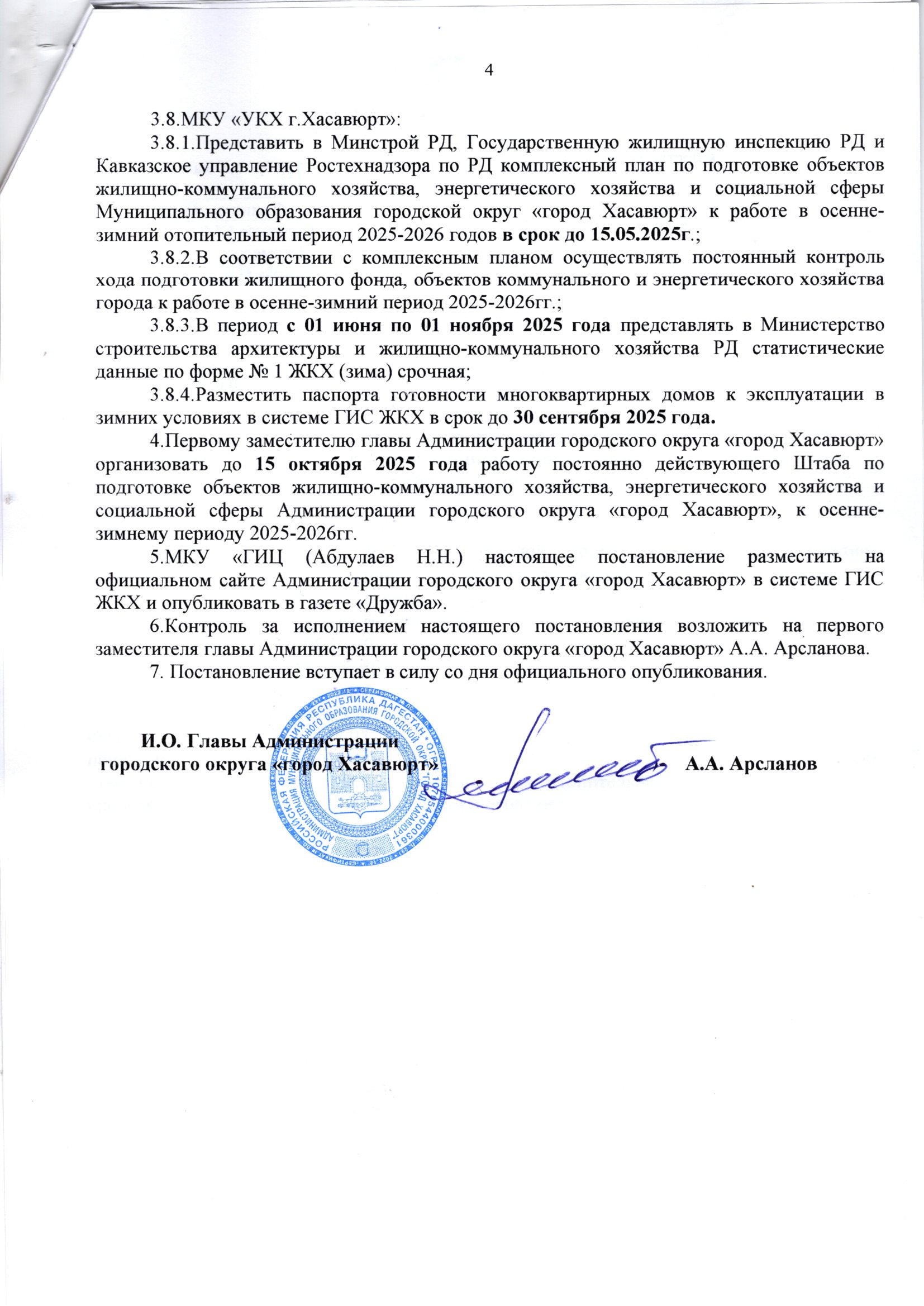Постановление от 08 мая 2024 г. № 65п О подготовке объектов жилищно-коммунального хозяйства, жилищного фонда и организаций бюджетной сферы Муниципального образования городской округ «город Хасавюрт» к работе в зимних условиях 2024-2025 гг.