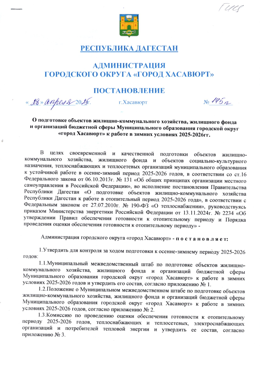 Постановление от 28 апреля 2025 г. № 145 п О подготовке объектов жилищно-коммунального хозяйства, жилищного фонда и организаций бюджетной сферы Муниципального образования городской округ "город Хасавюрт" к работе в зимних условиях 2025-2026гг.