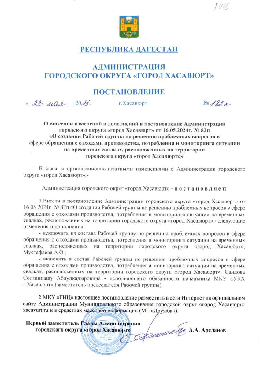 Постановление от 22 мая 2025 г. № 182 п О внесении изменений и дополнений в постановление Администрации городского округа "город Хасавюрт" от 16.05.2024г. № 82п "О создании Рабочей группы по решению проблемных вопросов в сфере обращения с отходами производства, потребления и мониторинга ситуации на временных свалках, расположенных на территории городского округа "город Хасавюрт""