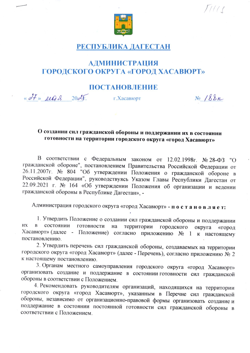 Постановление от 27 мая 2025 г. № 188 п О создании сил гражданской обороны и поддержании их в состоянии готовности на территории городского округа "город Хасавюрт"