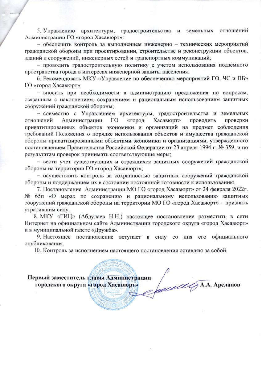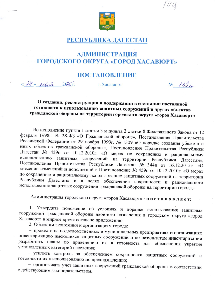 Постановление от 27 мая 2025 г. № 189 п О создании, реконструкции и поддержании в состоянии постоянной готовности к использованию защитных сооружений и других объектов гражданской обороны на территории городского округа "город Хасавюрт"