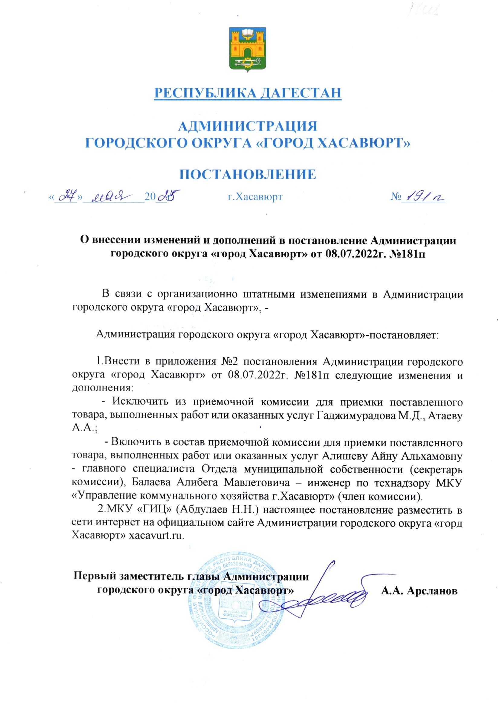 Постановление от 27 мая 2025 г. № 191 п О внесении изменений и дополнений в постановление Администрации городского округа "город Хасавюрт" от 08.07.2022г. №181п