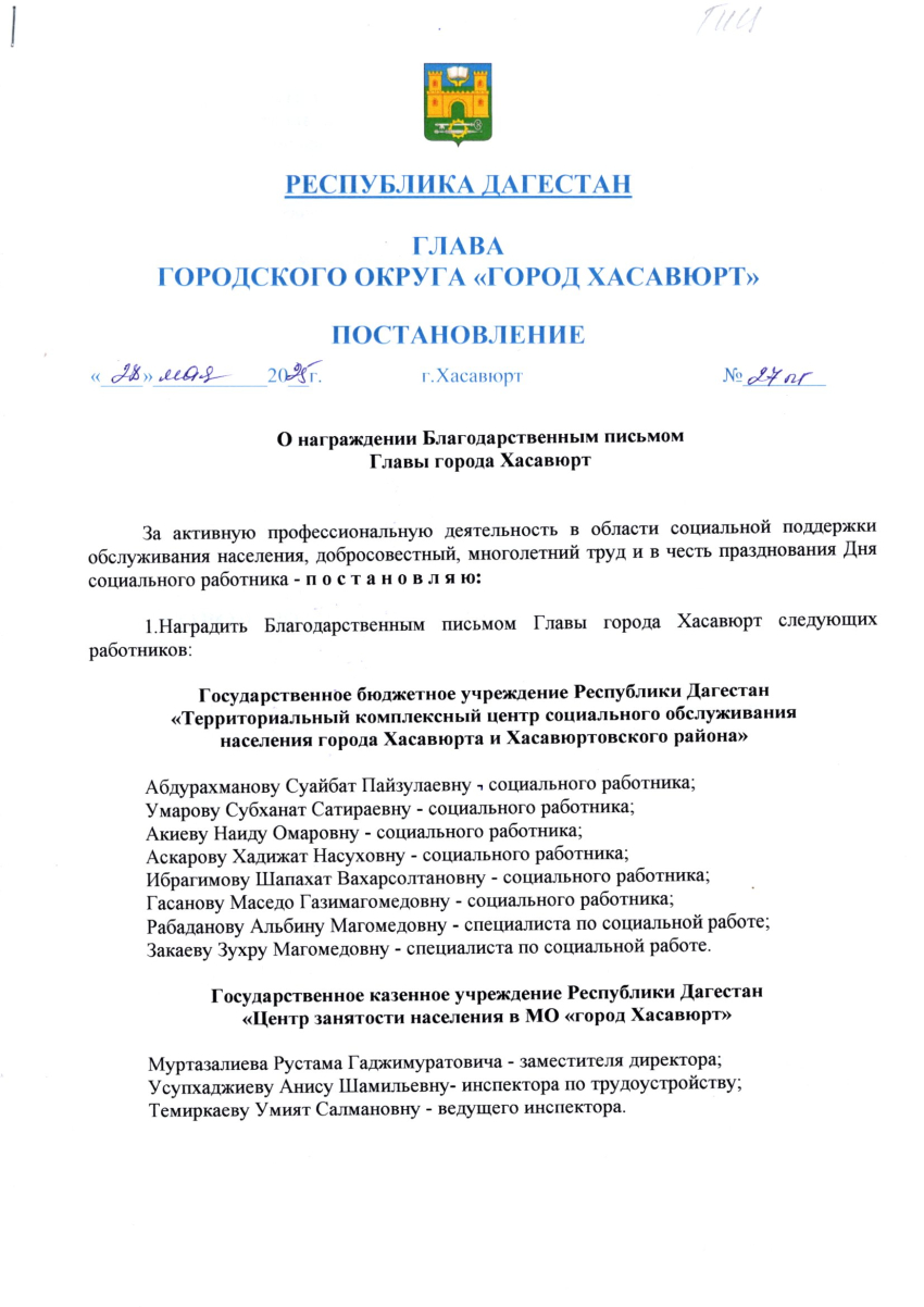 Постановление от 27 мая 2025 г. № 26 пг О награждении Благодарственным письмом Главы города Хасавюрт