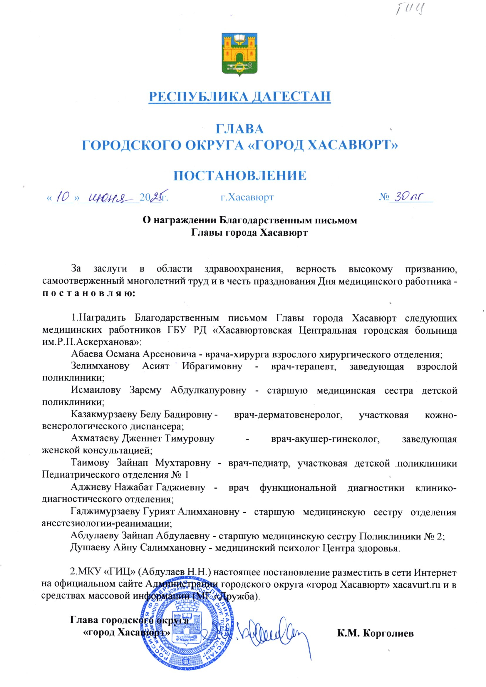 Постановление от 10 июня 2025 г. № 30 пг О награждении Благодарственным письмом Главы города Хасавюрт