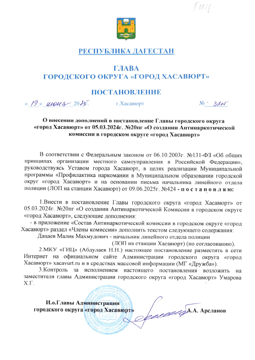 Постановление от 19 июня 2025г. № 32пг О внесении дополнений в постановление Главы городского округа «город Хасавюрт» от 05.03.2024 г. №20пг «О создании Антинаркотической комиссии в городском округе «город Хасавюрт»
