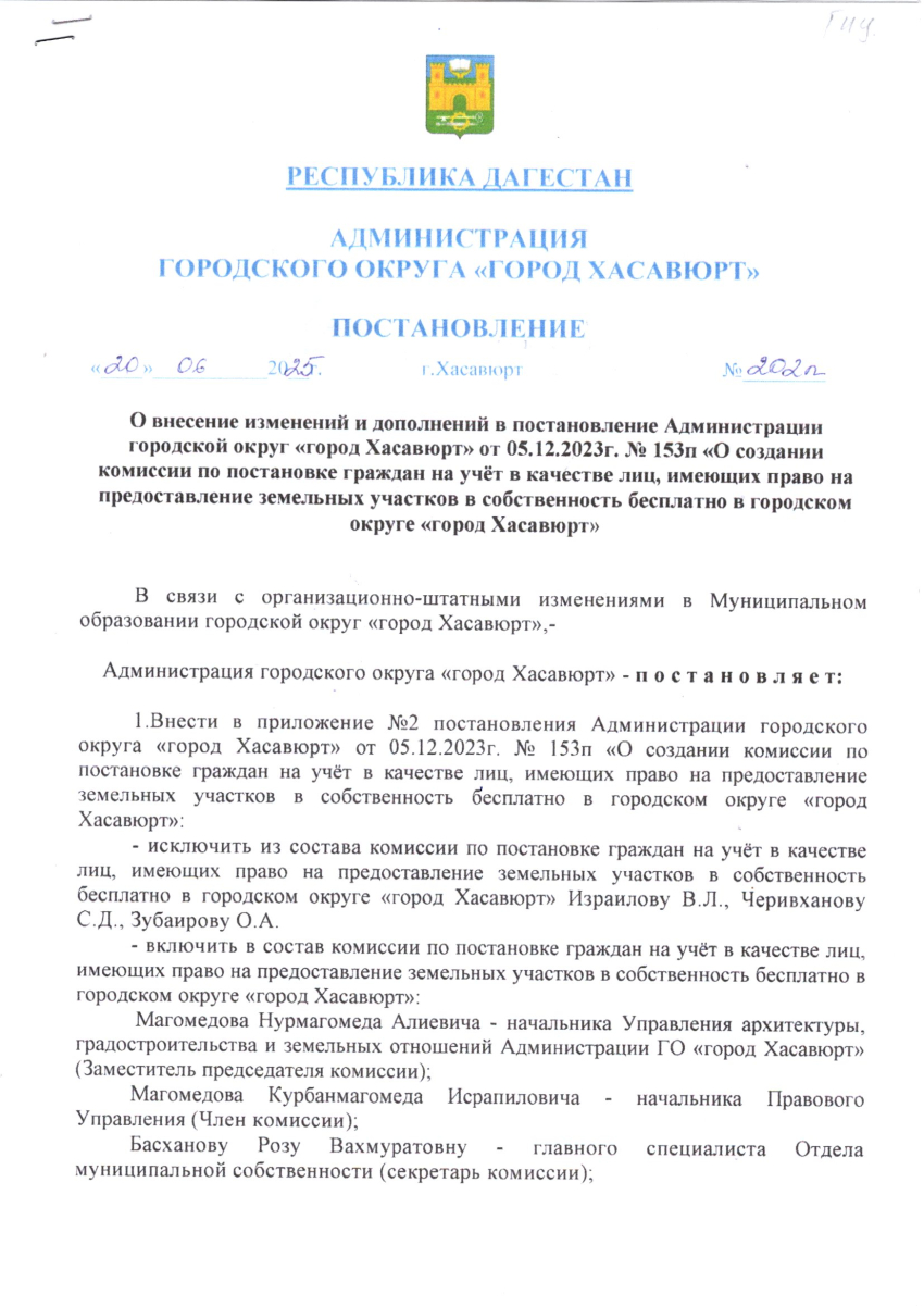 Постановление от 20.06.2025 г. № 202п О внесении изменений и дополнений в постановление Администрации городской округ «город Хасавюрт» от 05.12.2023г. №153п «О создании комиссии по постановке граждан на учёт в качестве лиц, имеющих право на предоставление земельных участков в собственность бесплатно в городском округе «город Хасавюрт»