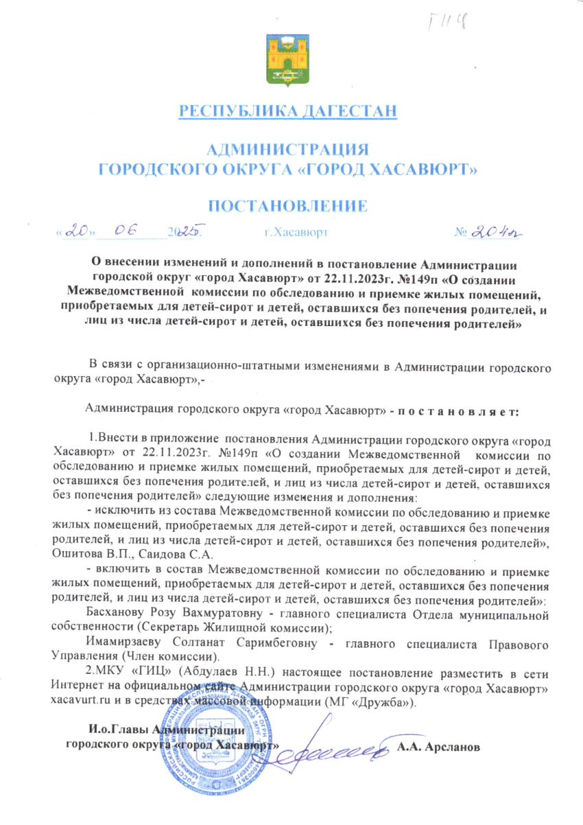 Постановление от 20.06.2025 г. № 204п О внесении изменений и дополнений в постановление Администрации городской округ «город Хасавюрт» от 22.11.2023г. №149п «О создании Межведомственной комиссии по обследованию и приёмке жилых помещений, приобретаемых для детей-сирот и детей, оставшихся без попечения родителей, и лиц из числа детей-сирот и детей, оставшихся без попечения родителей»