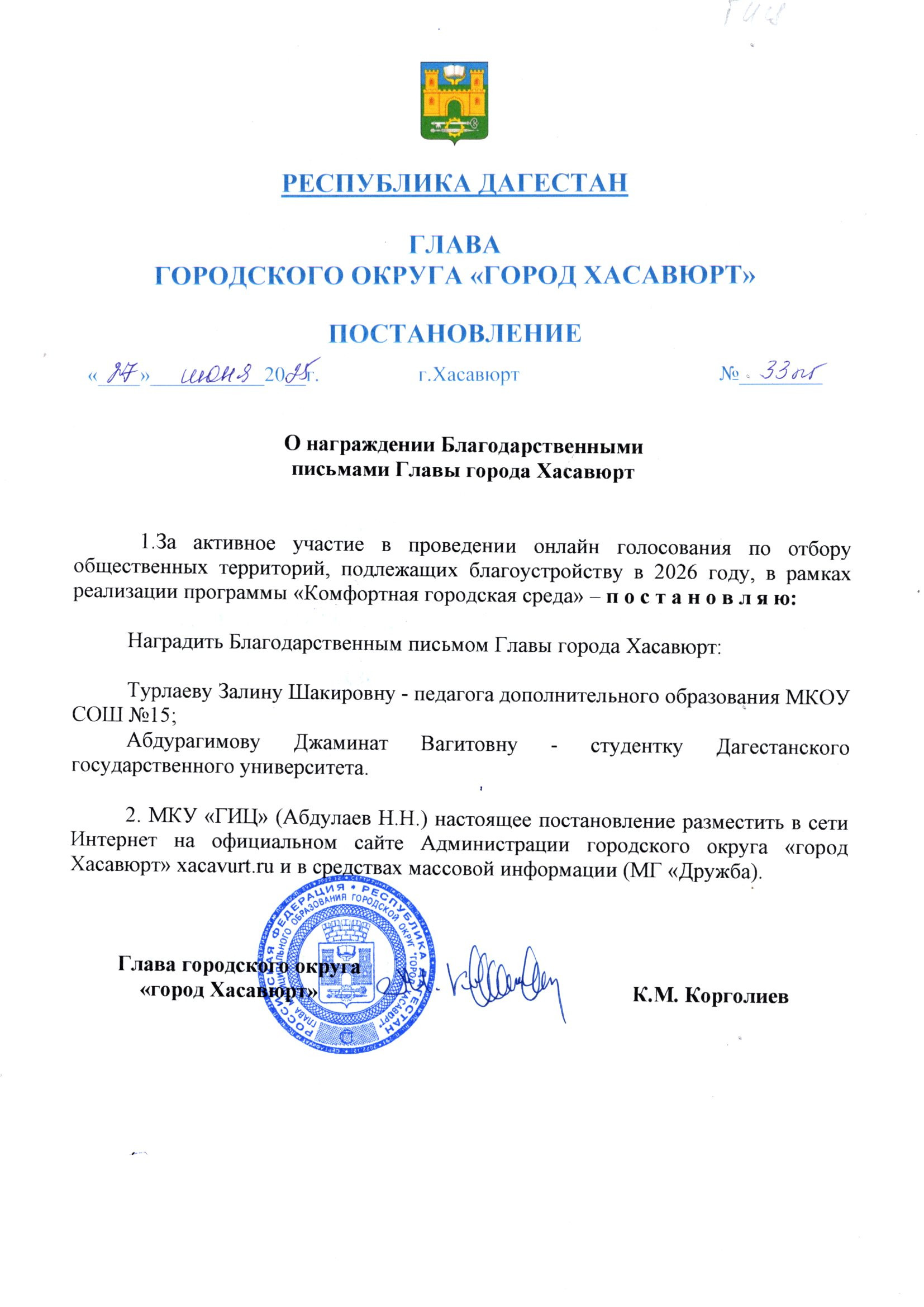 Постановление от 27 июня 2025 г. № 33пг О награждении Благодарственными письмами Главы города Хасавюрт
