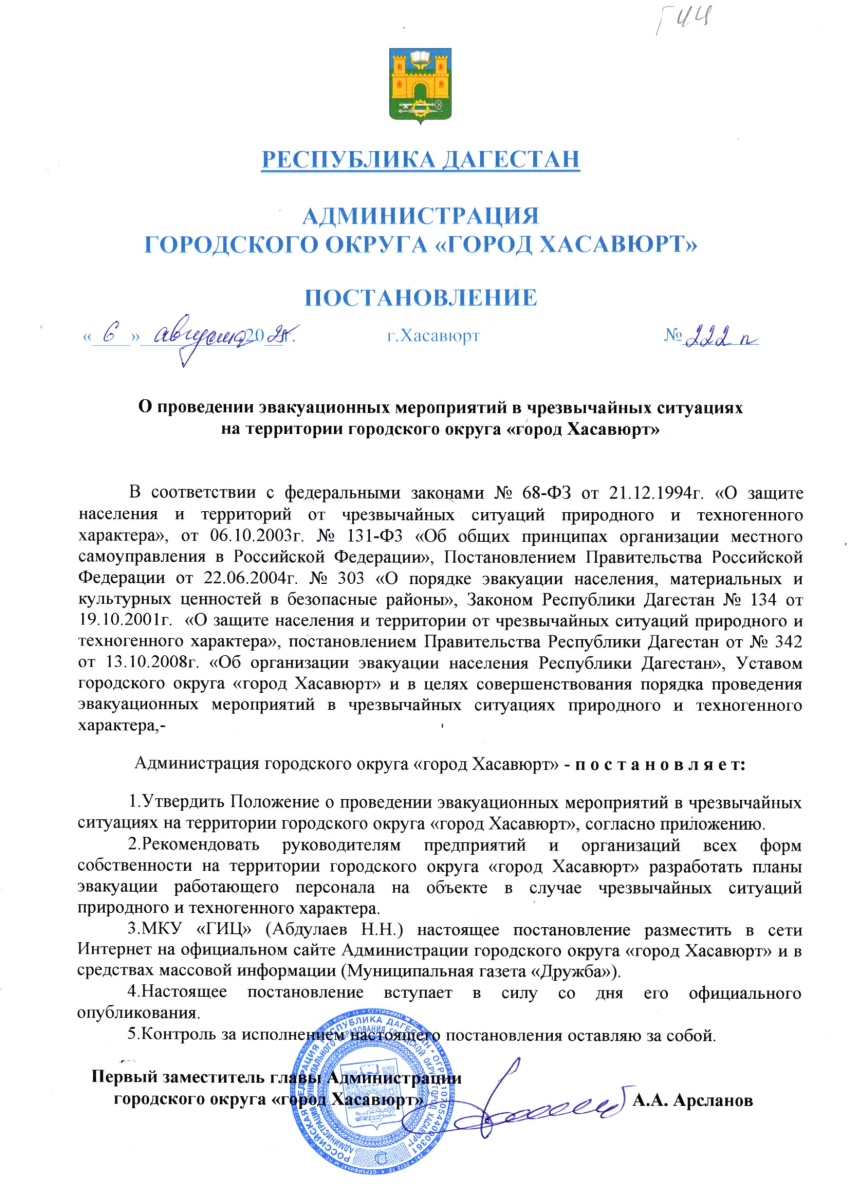Постановление от 6 августа 2025 г. № 222 п О проведении эвакуационных мероприятий в чрезвычайных ситуациях на территории городского округа "город Хасавюрт"