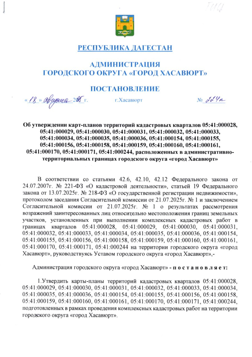 Постановление от 18 августа 2025 г. № 224п Об утверждении карт-планов территорий кадастровых кварталов