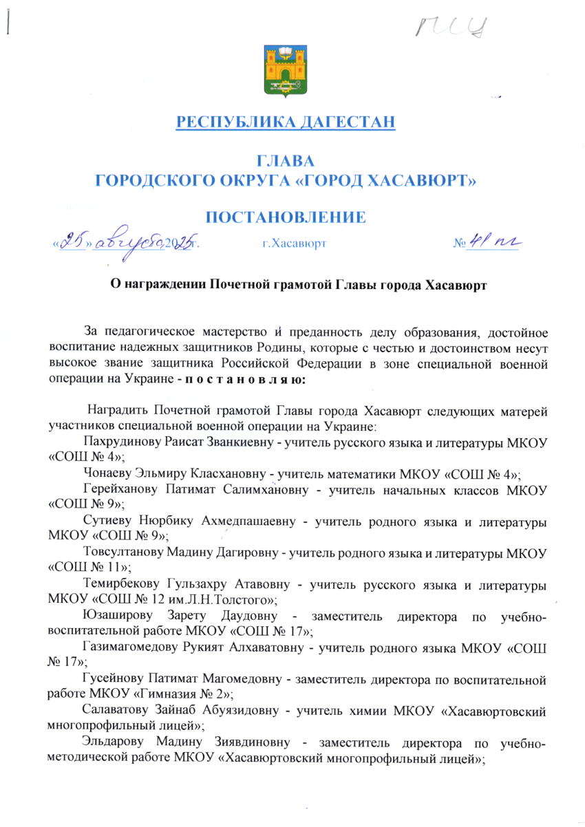 Постановление от 25 августа 2025 г. № 41 пг О награждении Благодарственным письмом Главы города Хасавюрт