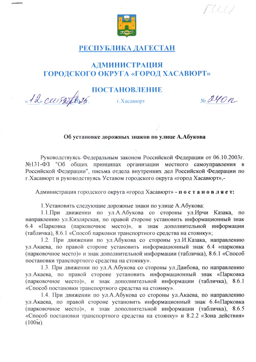 Постановление от 12 сентября 2025 г. № 240 п Об установке дорожных знаков по улице А.Абукова