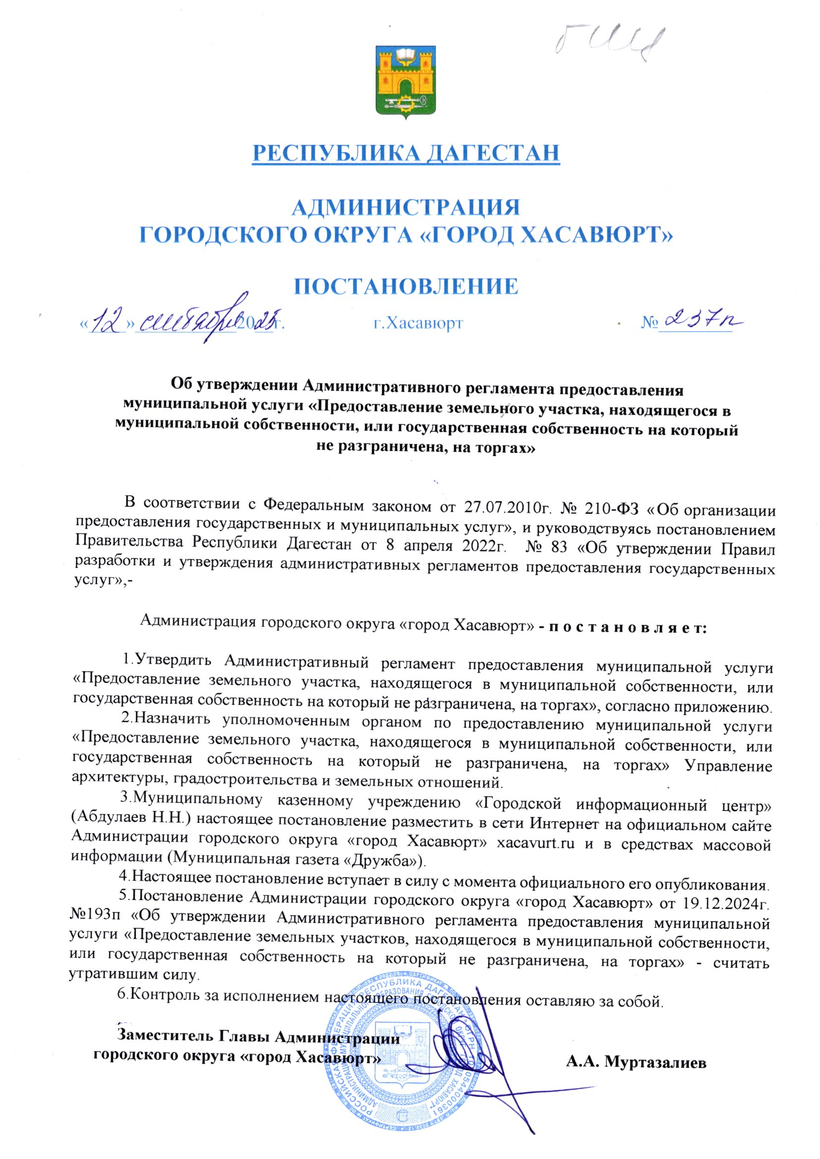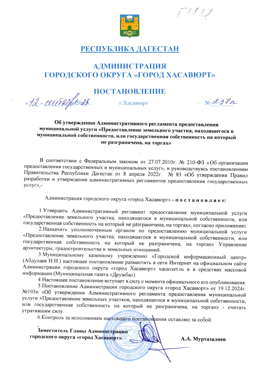 Постановление от 12 сентября 2025 г. № 237 п Об утверждении Административного регламента предоставления муниципальной услуги «Предоставление земельного участка, находящегося в муниципальной собственности, или государственная собственность на который не разграничена, на торгах»