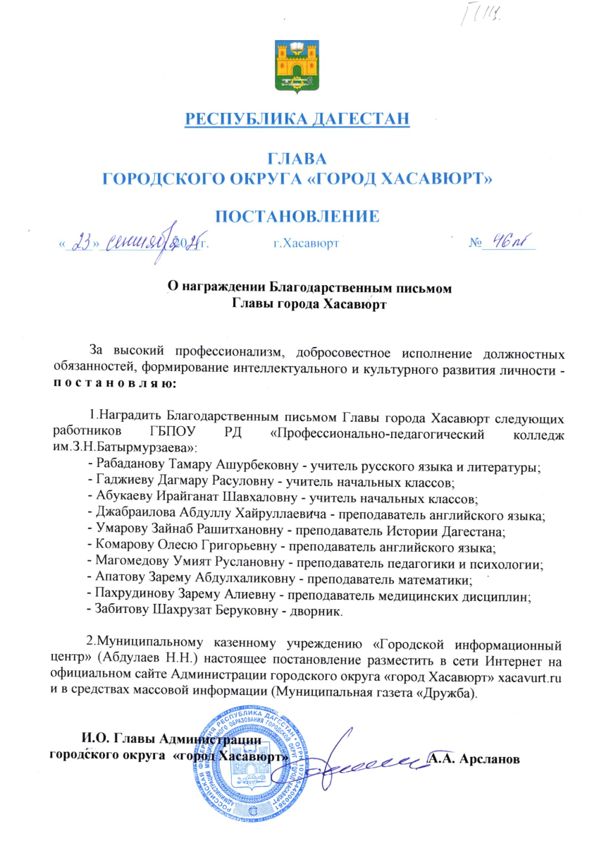 Постановление от 23 сентября 2025 г. № 46пг О награждении Благодарственным письмом Главы города Хасавюрт