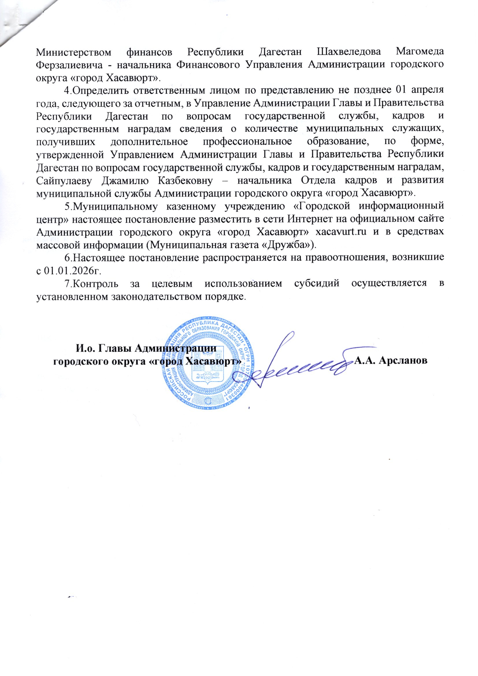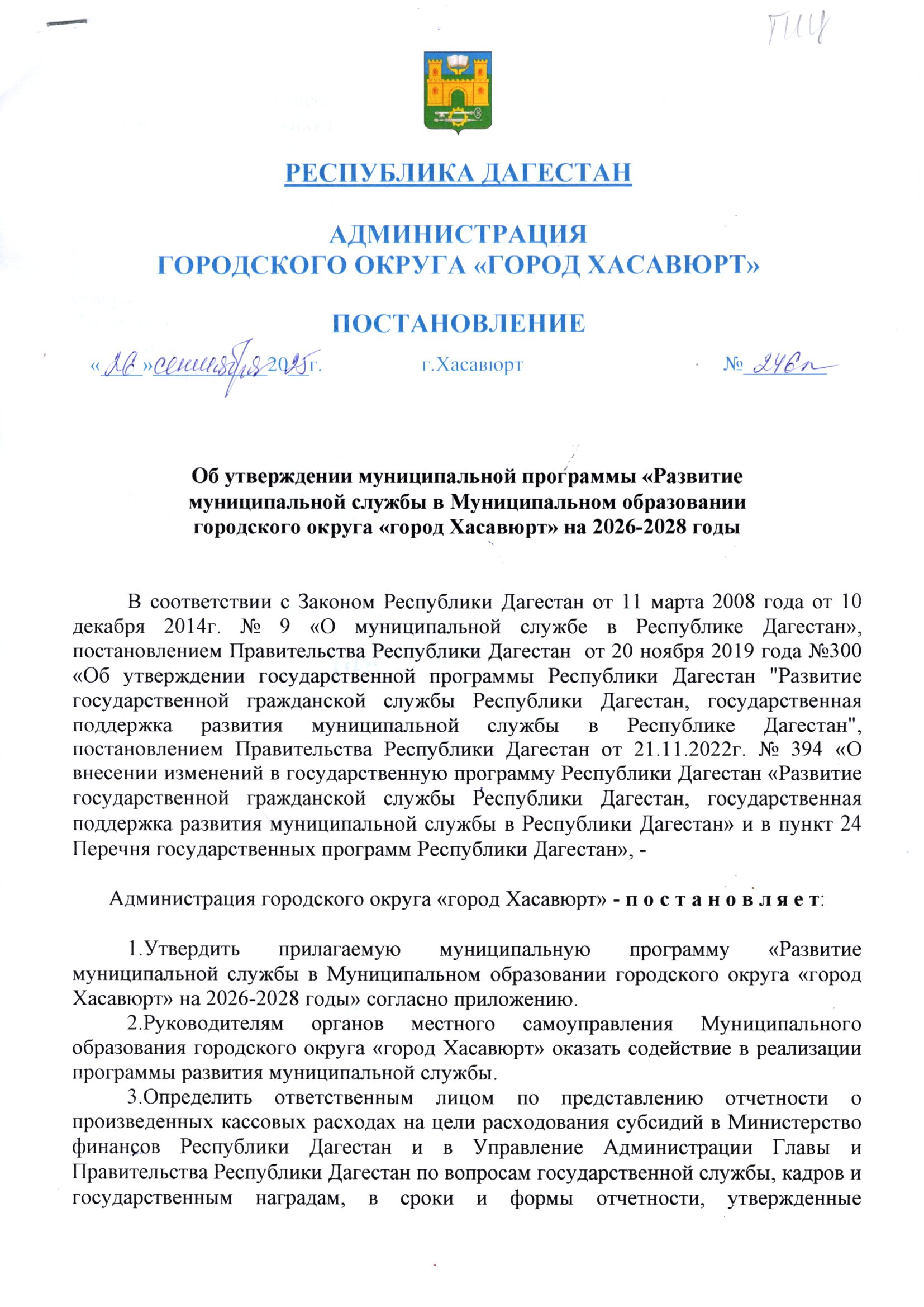 Постановление от 26 сентября 2025 г. № 246п Об утверждении муниципальной программы «Развитие муниципальной службы в Муниципальном образовании городского округа «город Хасавюрт» на 2026-2028 годы