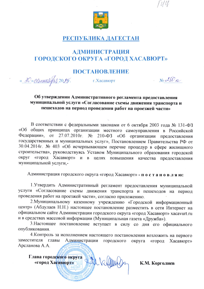 Постановление от 30 сентября 2025 г. № 250п Об утверждении Административного регламента предоставления муниципальной услуги «Согласование схемы движения транспорта и пешеходов на период проведения работ на проезжей части»