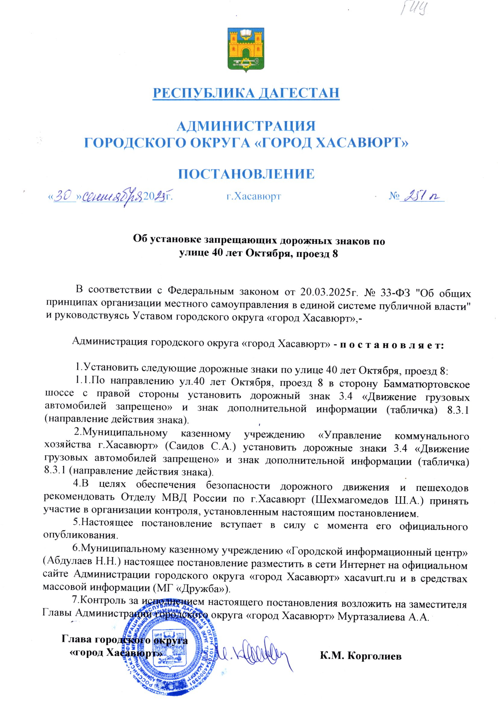 Постановление от 30 сентября 2025 г. № 251п Об установке запрещающих дорожных знаков по улице 40 лет Октября, проезд 8
