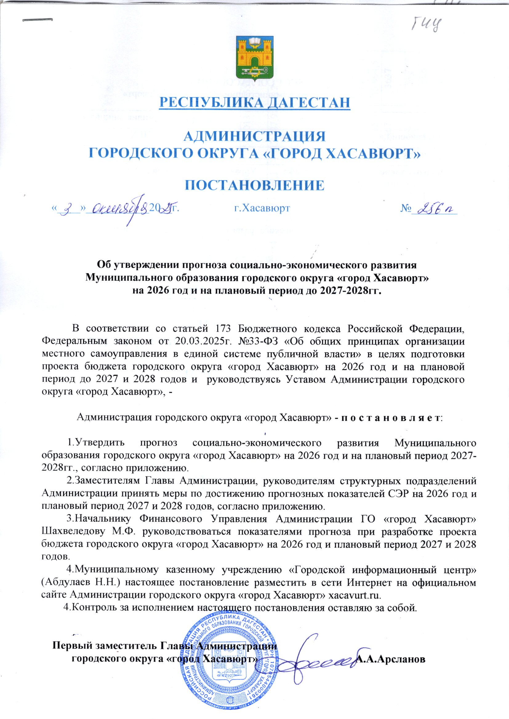 Постановление от 3 октября 2025 г. № 256п Об утверждении прогноза социально-экономического развития Муниципального образования городского округа «город Хасавюрт» на 2026 год и на плановый период до 2027-2028гг.
