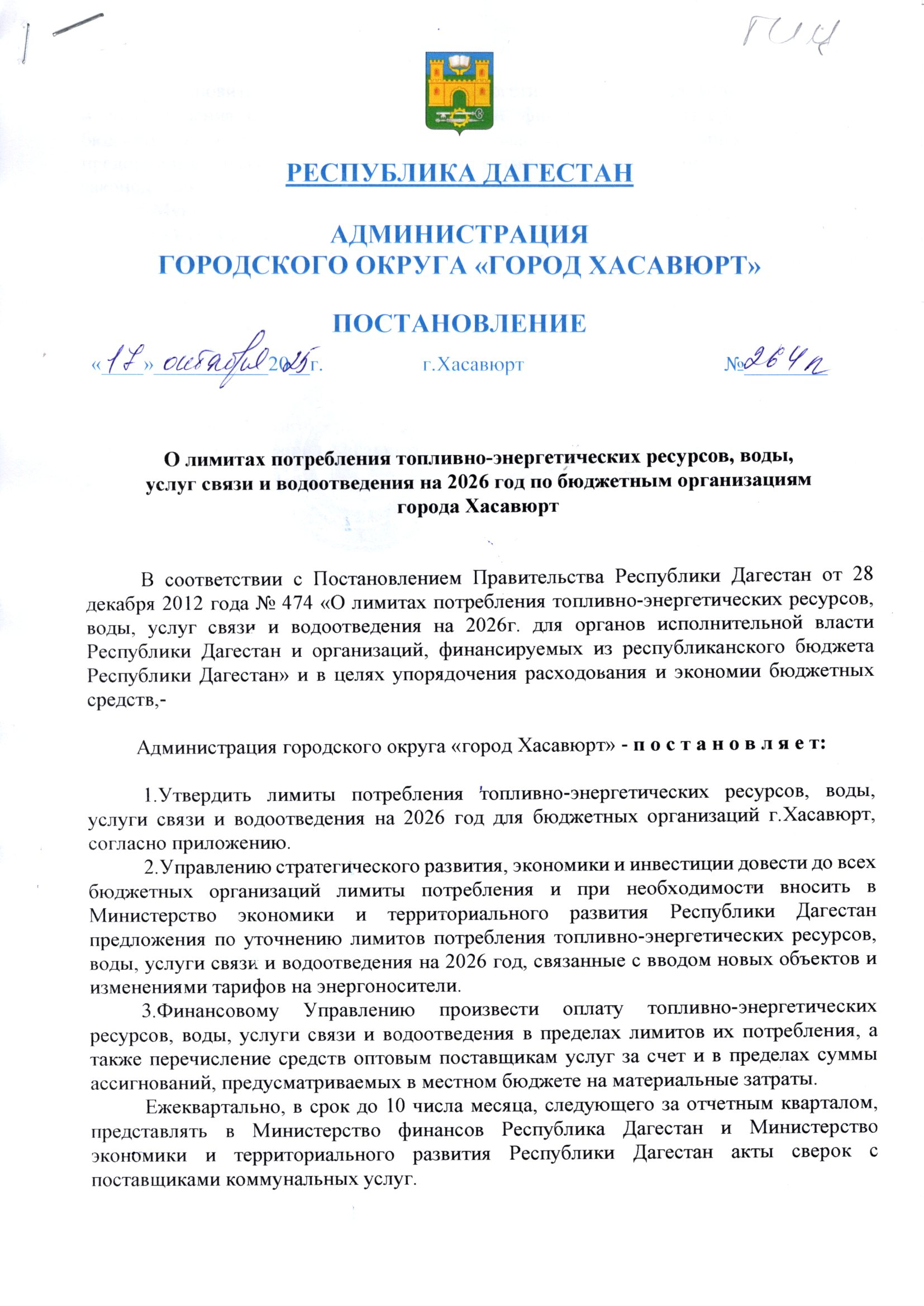 Постановление от 13 октября 2025 г. № 264п О лимитах потребления топливно-энергетических ресурсов, воды, услуг связи и водоотведения на 2026 год по бюджетным организациям города Хасавюрт