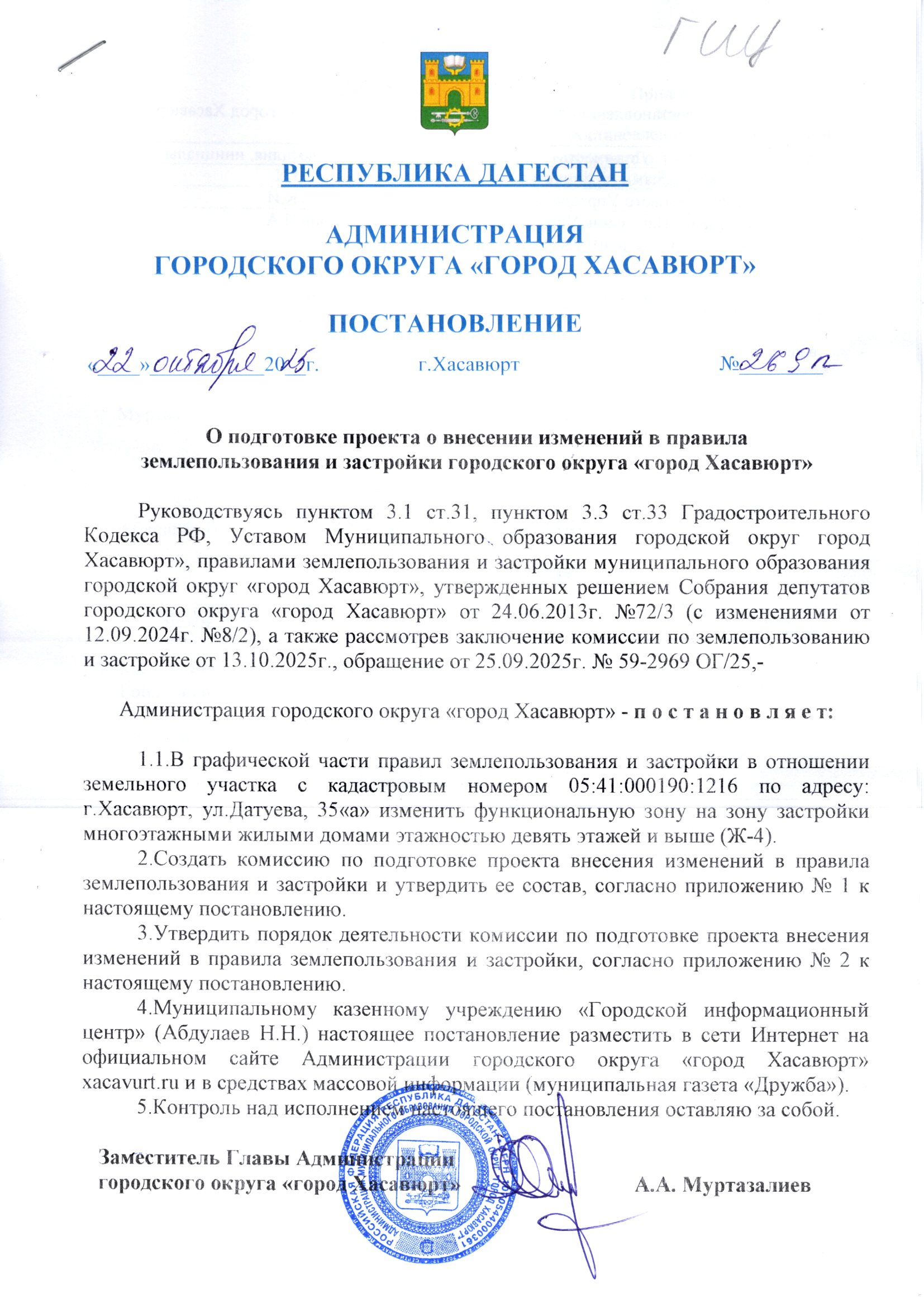 Постановление от 22 октября 2025 г. № 269 п О подготовке проекта о внесении изменений в правила землепользования и застройки городского округа «город Хасавюрт»
