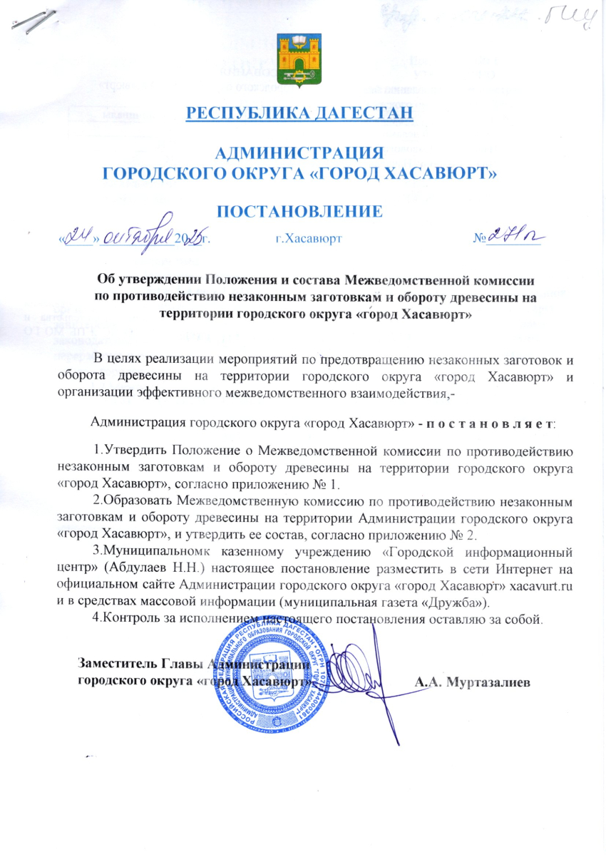 Постановление от 24 октября 2025 г. № 271 п Об утверждении Положения и состава Межведомственной комиссии по противодействию незаконным заготовкам и обороту древесины на территории городского округа «город Хасавюрт»