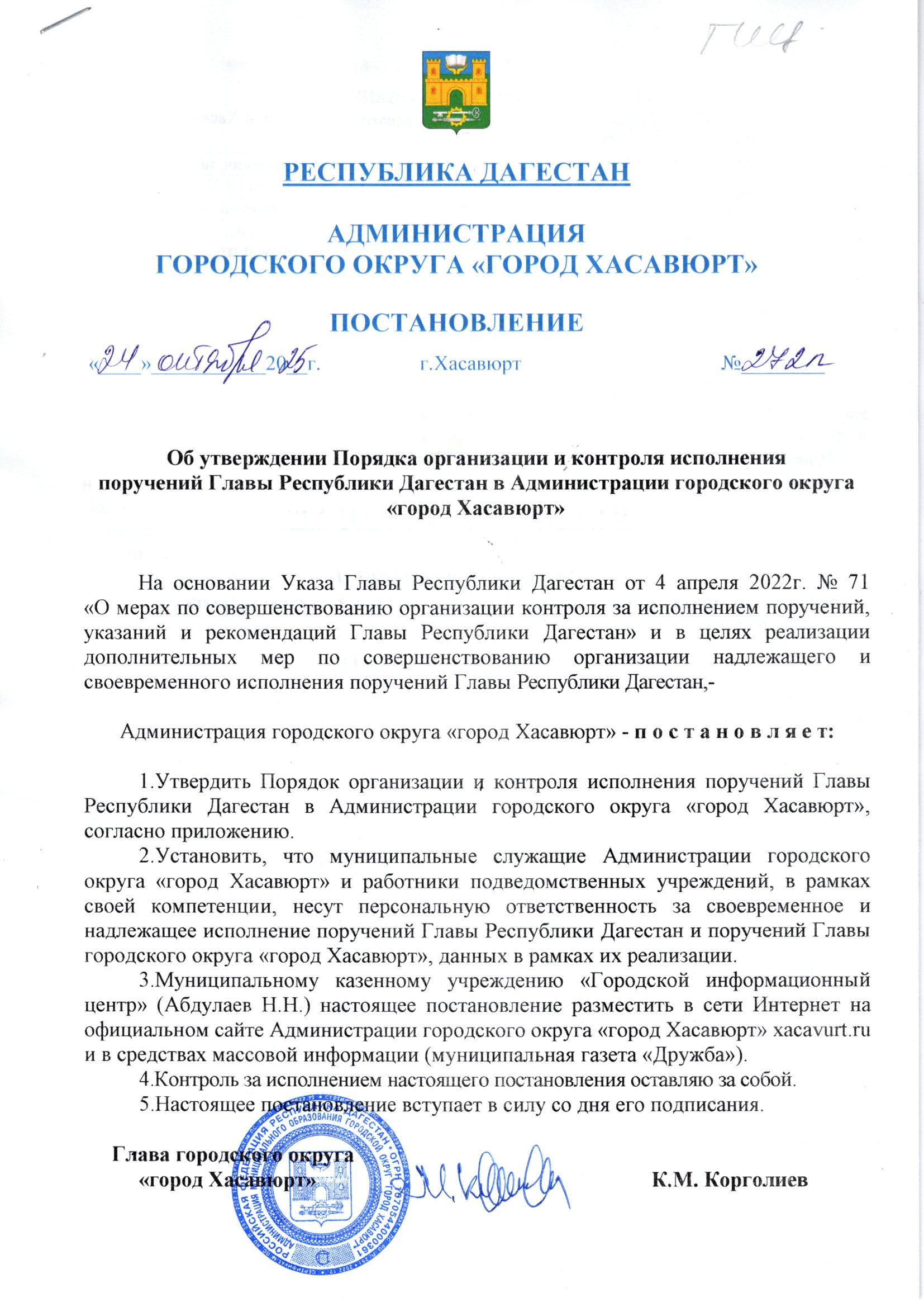 Постановление от 24 октября 2025 г. № 272 п Об утверждении Порядка организации и контроля исполнения поручений Главы Республики Дагестан в Администрации городского округа «город Хасавюрт»