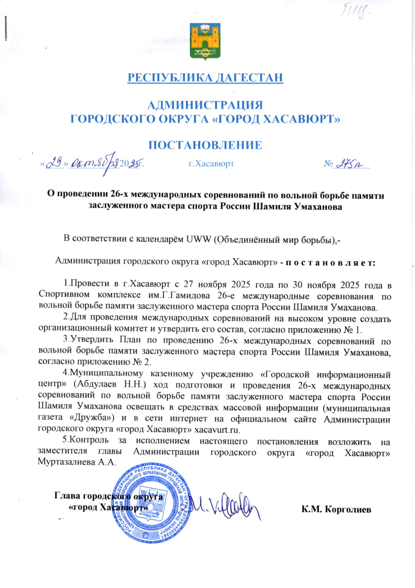 Постановление от 29 октября 2025 г. № 275 п О проведении 26-х международных соревнований по вольной борьбе памяти заслуженного мастера спорта России Шамиля Умаханова