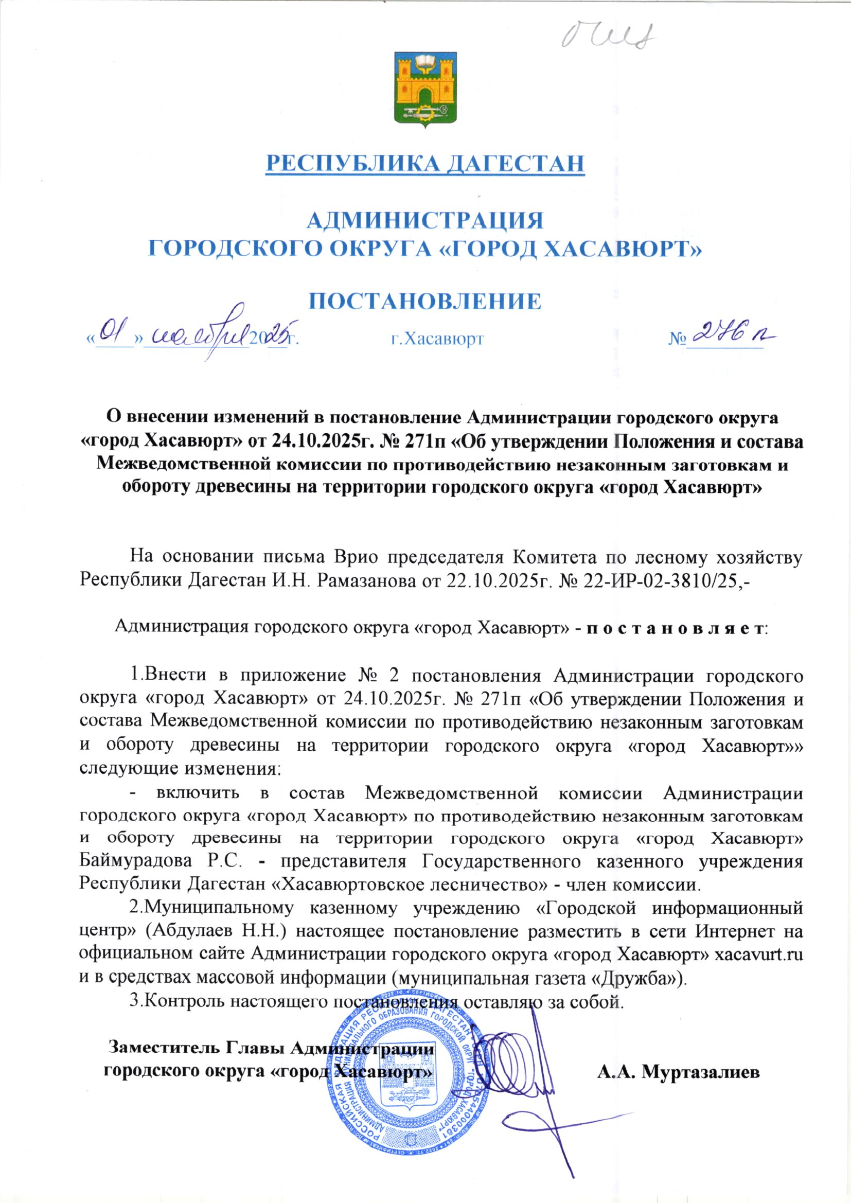 Постановление от 01 ноября 2025 г. № 276 п О внесении изменений в постановление Администрации городского округа «город Хасавюрт» от 24.10.2025г. № 271п «Об утверждении Положения и состава Межведомственной комиссии по противодействию незаконным заготовкам и обороту древесины на территории городского округа «город Хасавюрт»