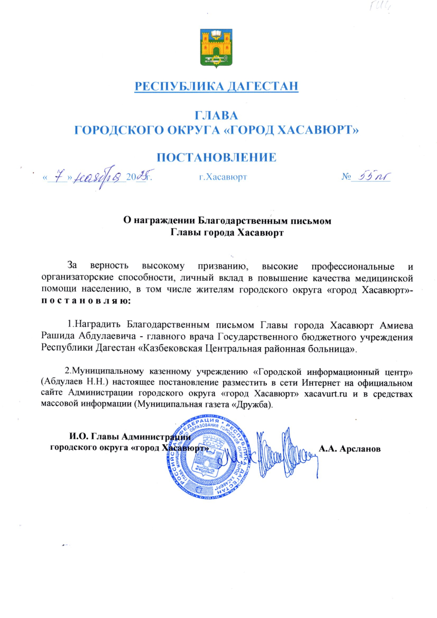 Постановление от 7 ноября 2025 г. № 55 пг О награждении Благодарственным письмом Главы города Хасавюрт